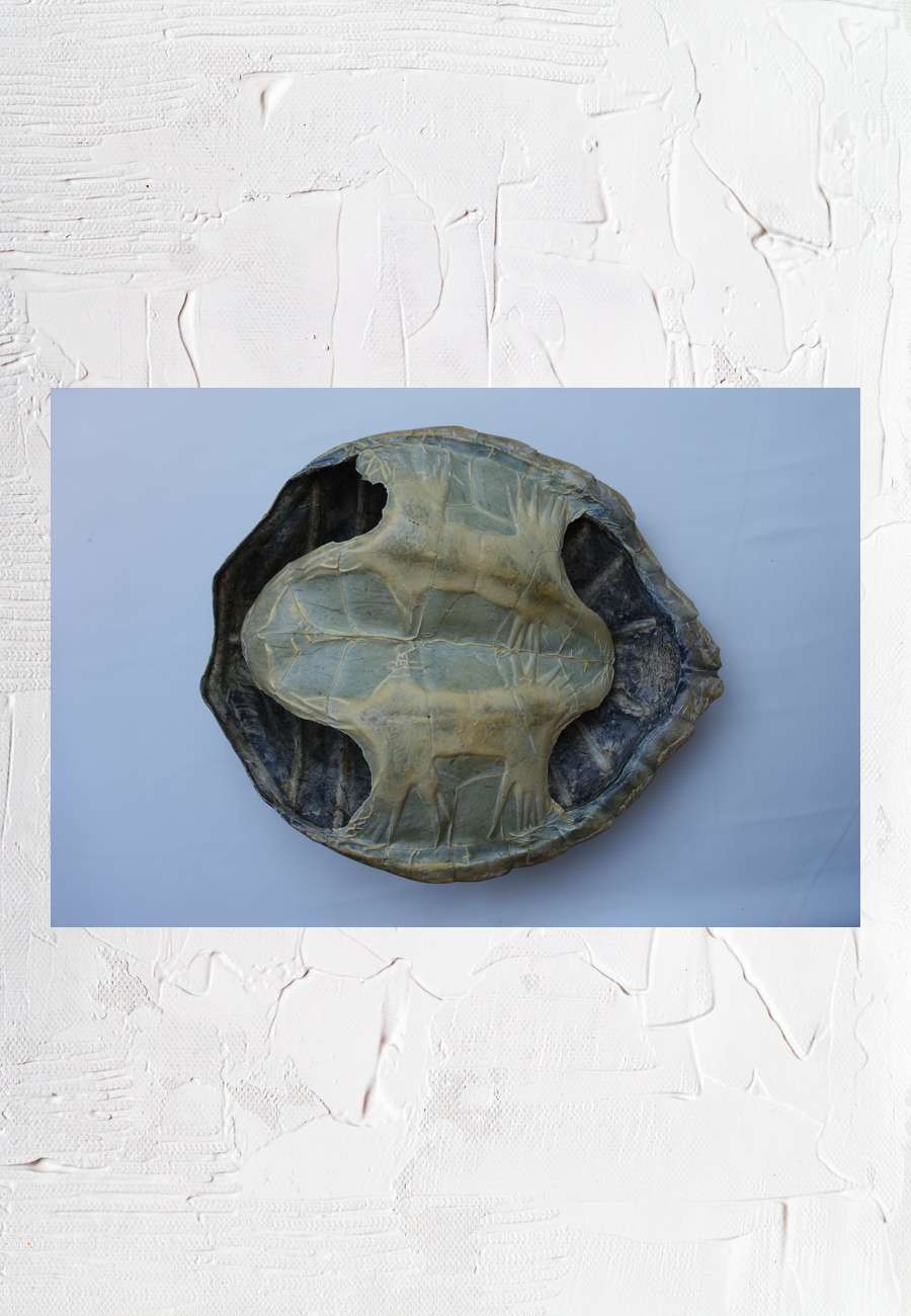Hier der schon beschriebene komplette Panzer einer Meeresschildkröte, diesmal aus der Sicht von unten (Plastron), die konkav nach innen gewölbte Vertiefung läßt ein männliches Tier erkennen, zudem wird das Skelett teilweise sichtbar. Größe ca. 35 cm.