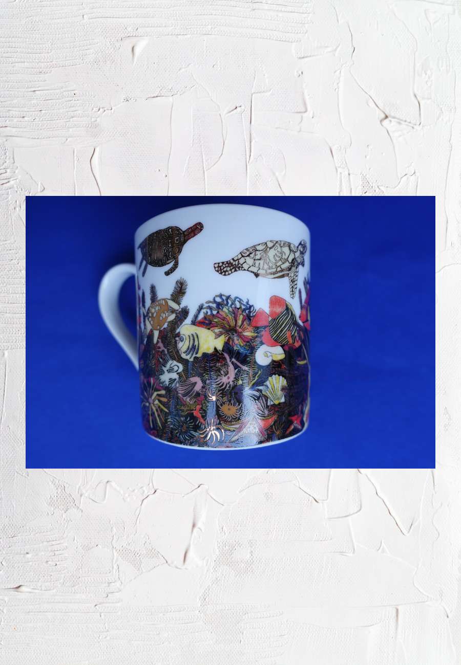 Tasse (Arthouse Unlimited), u.a. mit 5 Meeresschildkröten, innen mit dem Hinweis "Care for all our creatures", Fine bone China, hand decorated in England.