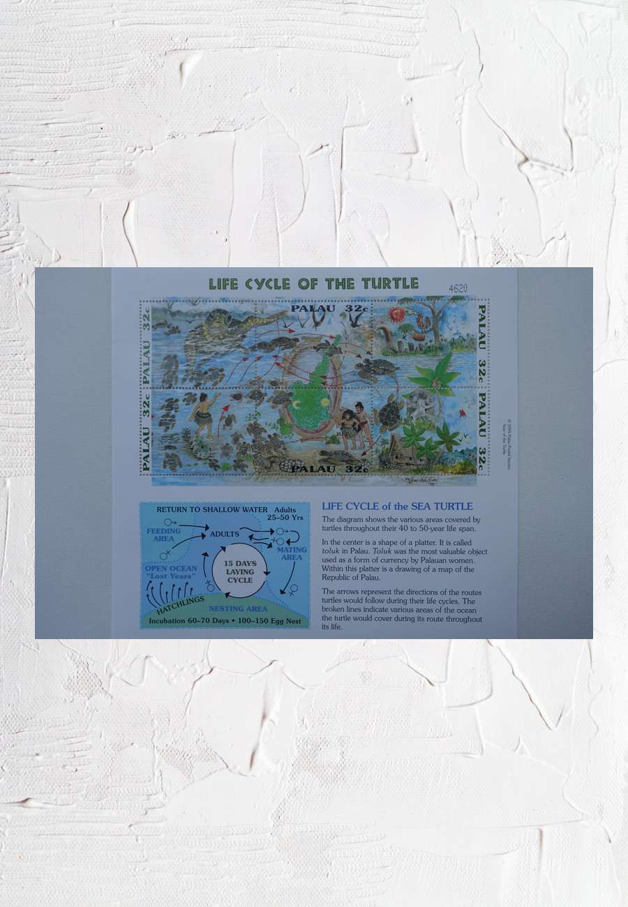 Großer Block (Ausschnitt) aus Palau. "Year of the Turtle" (1995) mit einer Beschreibung zum Leben einheimischer Meeresschildkröten, Format insgesamt 17,7 x 26 cm.