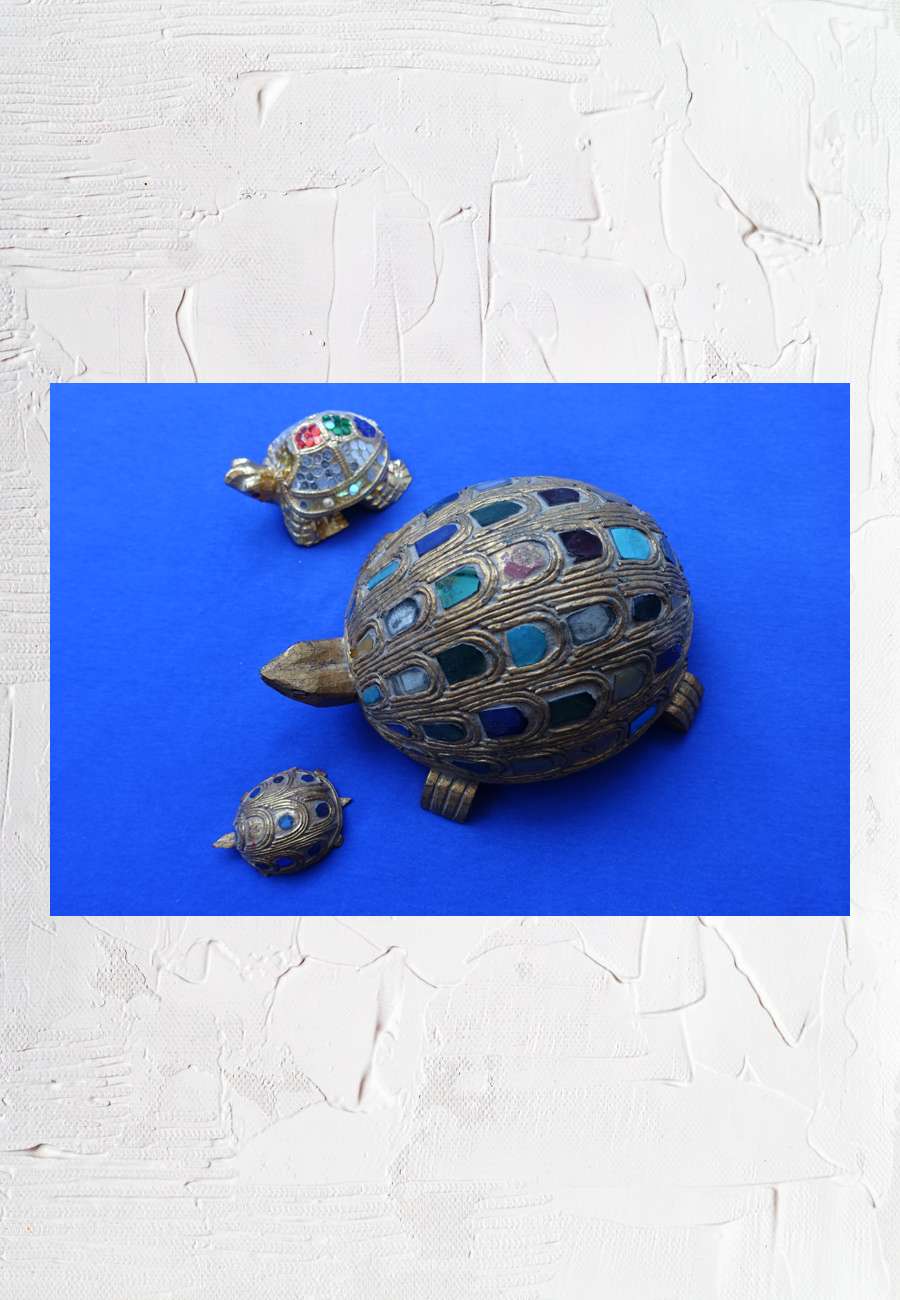 Die handbemalten Objekte sind mit farbigen Glasstückchen verziert, Größe zwischen 6,5 und 19 cm.