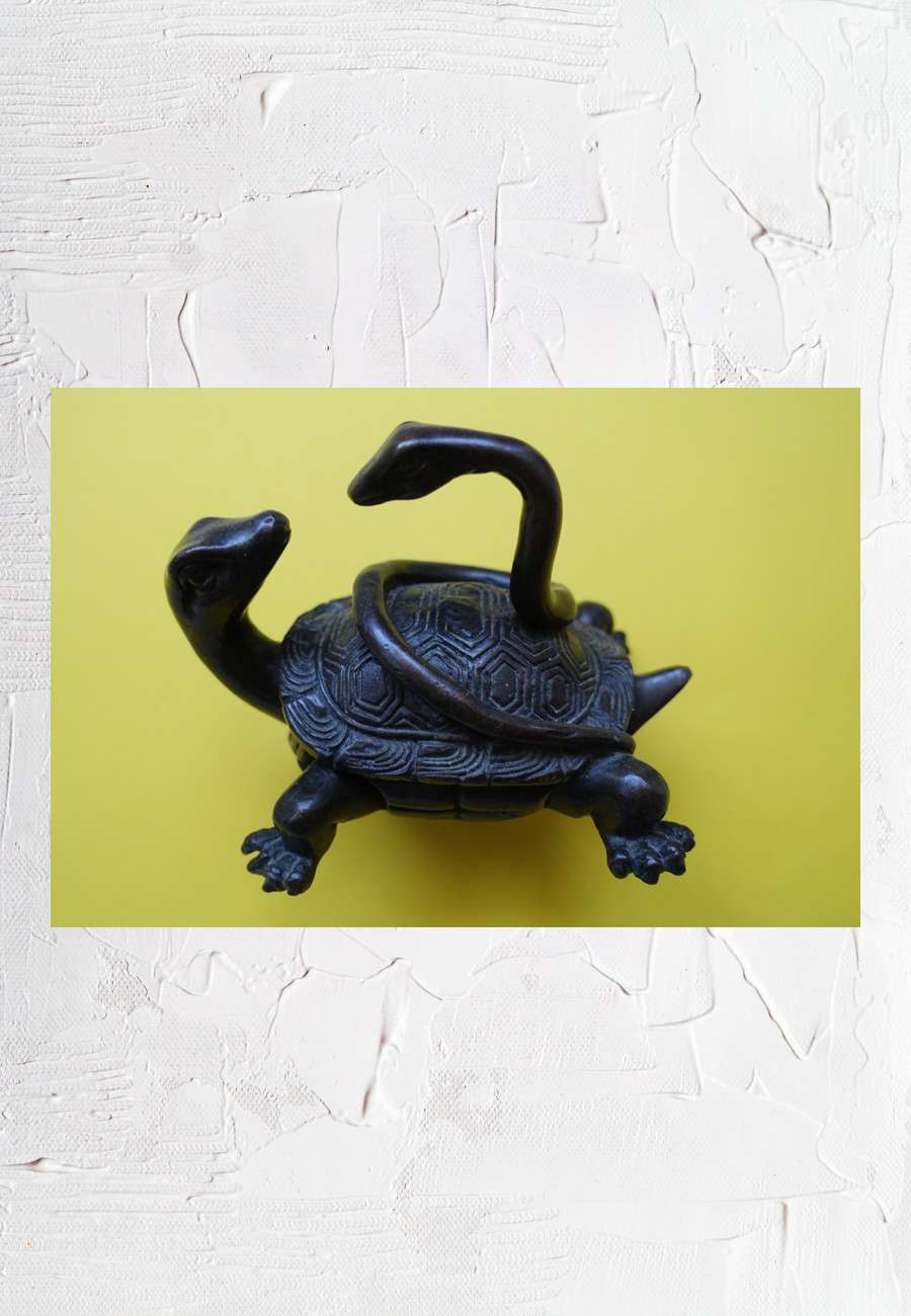 Messing-Guss aus Indien, patiniert, mit aufsitzender Schlange, ein Motiv das auch in anderen Kulturen vorkommt, Größe ca. 11 cm. Das Objekt erinnert mich an das Fabelwesen "Schwarze Schildkröte" (Xuanwu) eine Kombination von Schildkröte und Schlange, die insbesondere im alten China den Norden und den Winter repräsentieren (japanische Bezeichnung Genbu). Beide Tiere sind auch Symbol für Langlebigkeit, vielleicht deshalb heute in Asien als Schmuckstück oder sogar als Tattoo beliebt. Zu den genannten Fabelwesen gibt es zwar kein eigenes Objekt, aber eine Reihe von Abbildungen.
