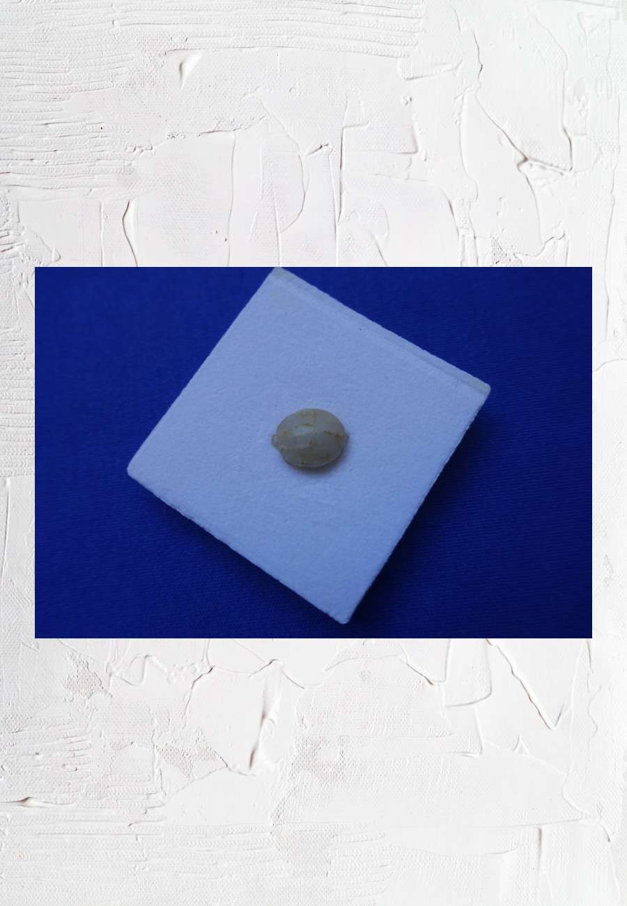 Antiker Chalcedon (Halbedelstein), durchscheinend und geädert, aus Phönizien, ein Land an der östlichen Mittelmeerküste (im heutigen Gebiet von Libanon, Israel und Syrien), 5. Jhd. v. Chr., erworben über Jean-David Cahn (Basel), im Art-Loss-Register geprüft, Größe ca. 1,3 cm. Neben einer antiken griechischen Münze (Hemibol/Lesbos) ist dies das kleinste Objekt von Bedeutung (manchmal nehmen die kleinsten Dinge einen besonderen Platz in unserem Herzen ein). Die Phönizier waren ein Seefahrer- und Handelsvolk. Auf einem großen Marmorrelief dieser Kultur (ca. 8. Jhd. v. Chr.) ist das Hauptmotiv ein von 4 Männern gerudertes Schiff, umgeben von Fischen und einer Schildkröte.