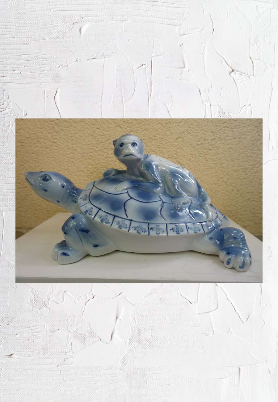 Auf dieser Schildkröte hat es sich ein Affe bequem gemacht, Made in China, Größe 35 cm.