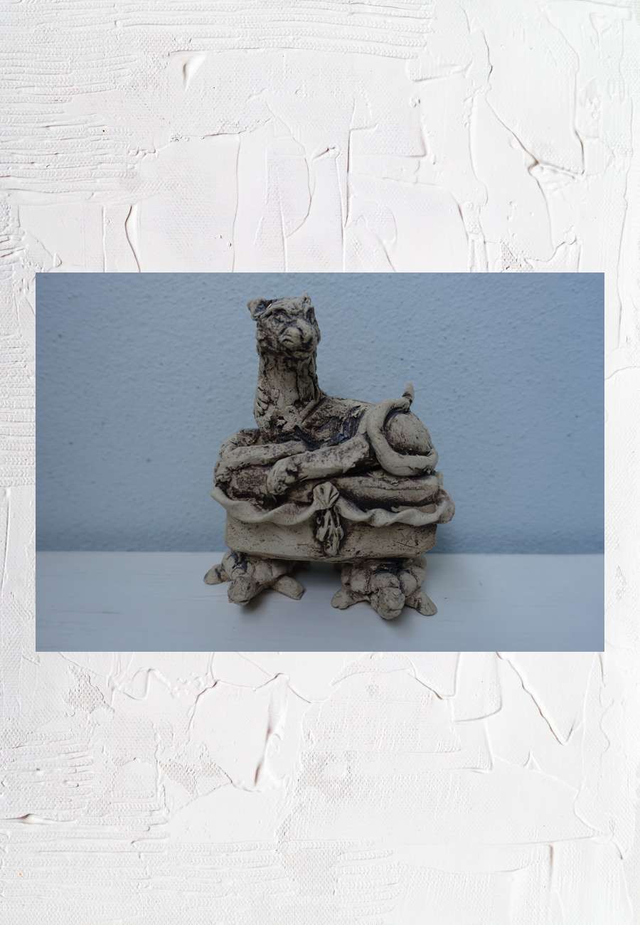 ca. 12 cm. Die angesehene Keramikerin, Bildhauerin und Malerin (mit Meisterprüfung, internationaler Ausstellungstätigkeit, Atelier in Haidhausen), spielt oft mit archaischen Formen und Motiven, die sie neu und expressiv interpretiert (s. auch zwei Kataloge). Schon zu ihrer Meisterprüfung gestaltete sie ein großartiges Nashorn, im Atelier präsentiert neben ihrer Diplomurkunde. Viele Arbeiten haben auch klassische oder literarische Bezüge.