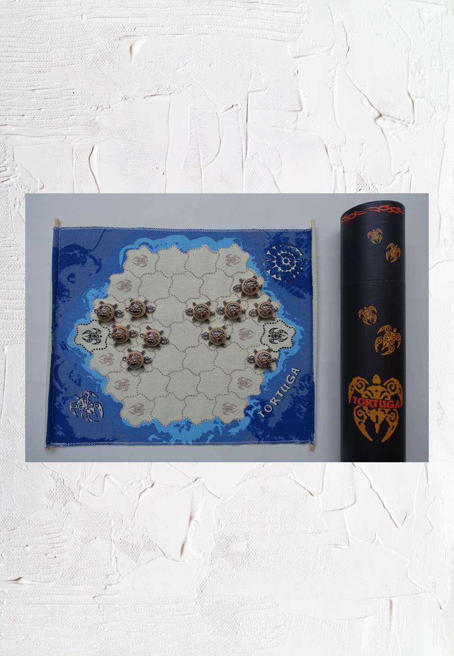 Spiel "Tortuga" (ab 8 Jahre), mit Spieltuch und 16 zweifarbige Schildkröten aus Holz, Konzept von Vincent Everaert, made in China.