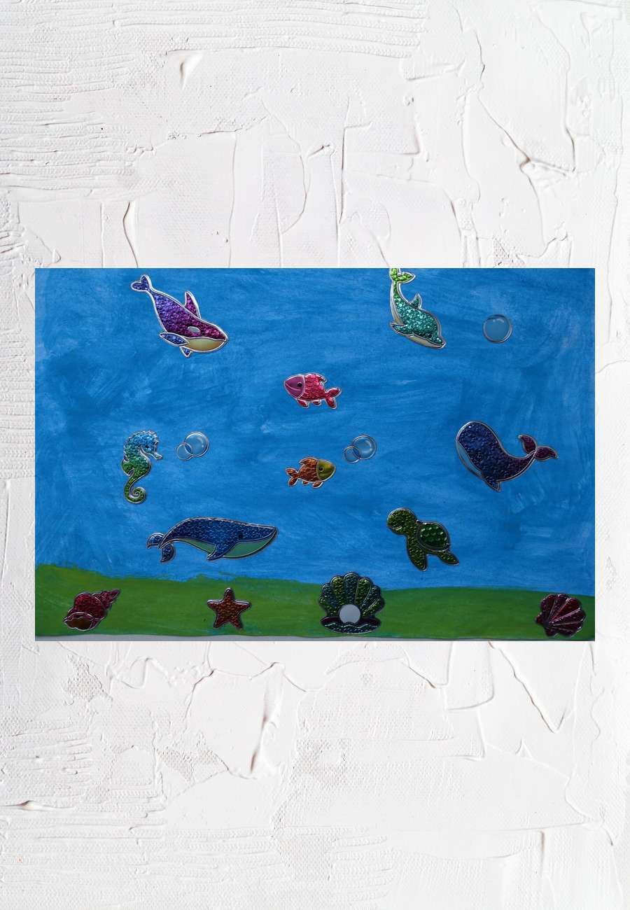 Collage aus Aquarell und metallig glitzernden Stickern, Format DIN A 4, Alter 8 Jahre.