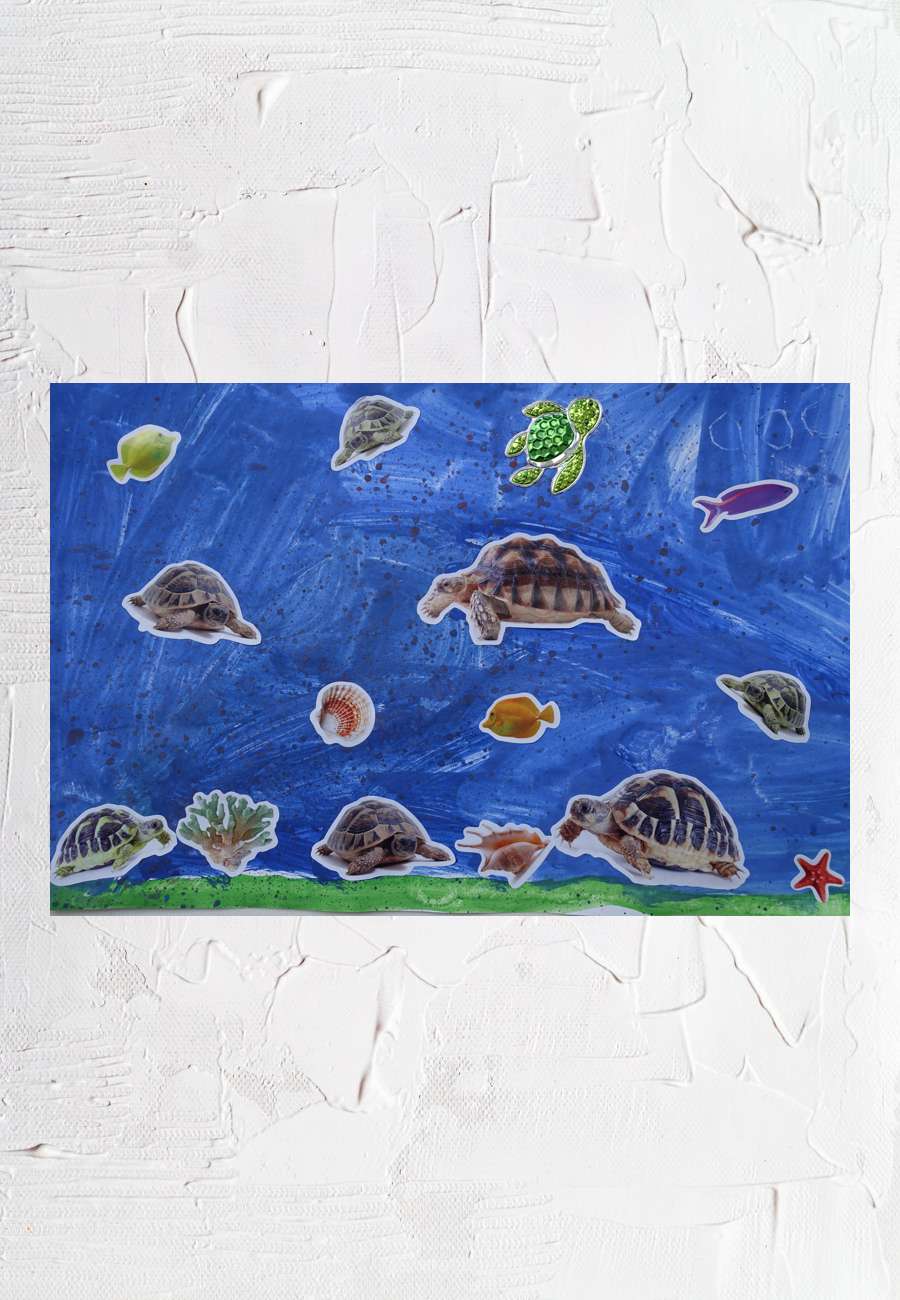 Collage aus Aquarell und Stickern, sign., Format DIN A 4, Alter 5 Jahre.