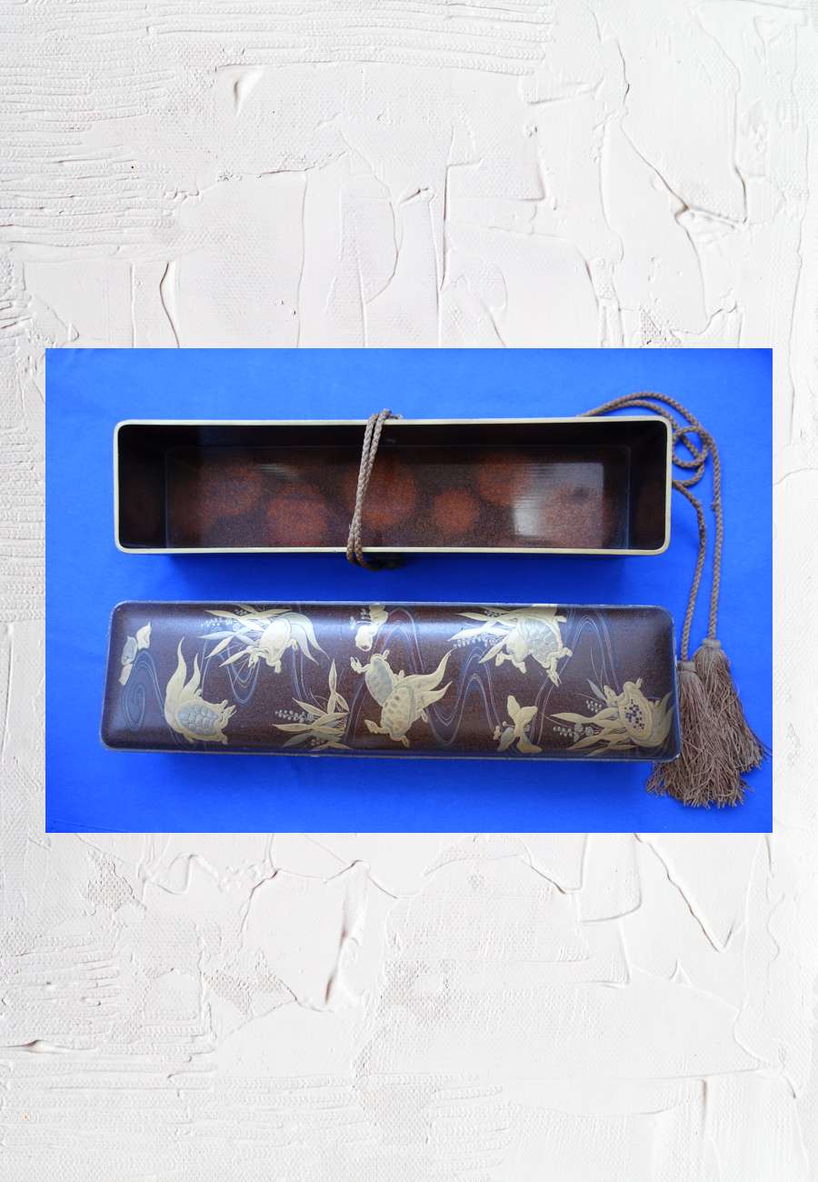 Holzschatulle aus Japan (Meiji-Zeit) und zugleich kunstvolle Lackarbeit, zur Aufbewahrung von Schmuck, Geld oder besonderen Briefen, kupferfarbener Lack mit Goldbemalung. Motive sind