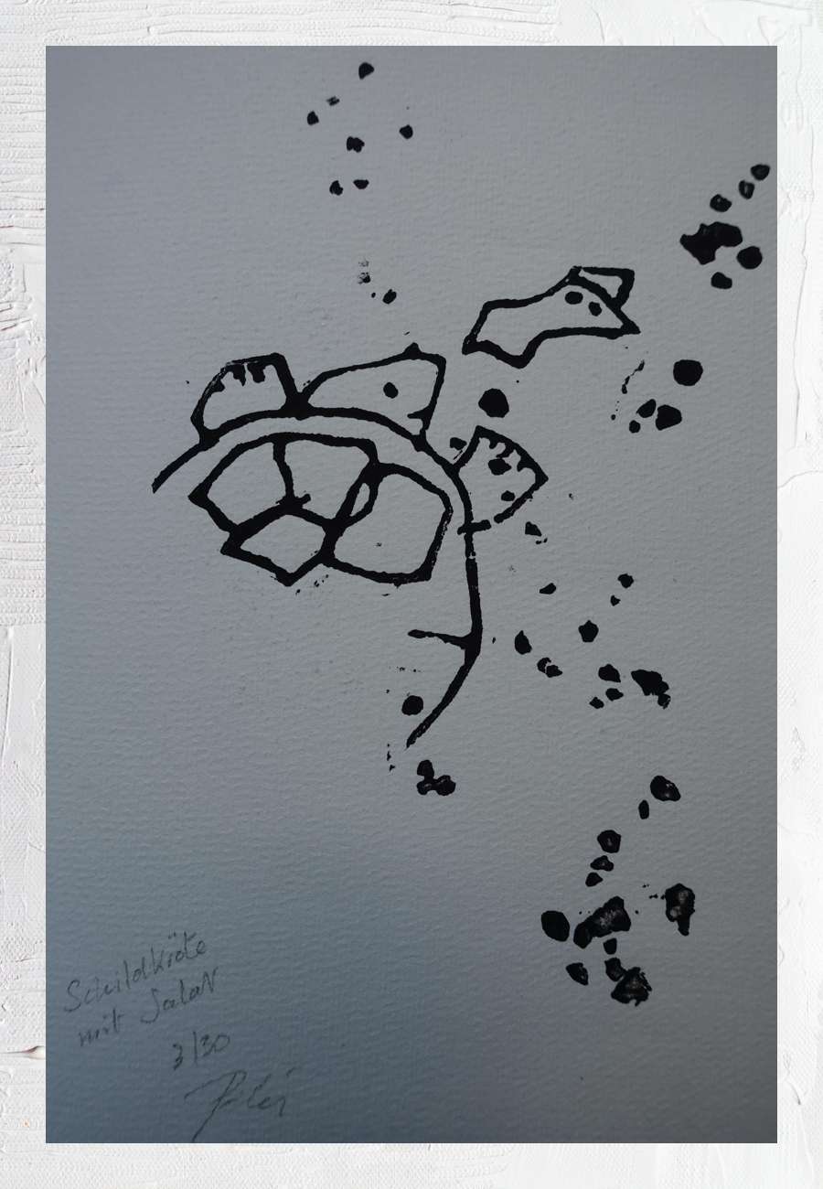 Holzschnitt, Titel "Schildkröte mit Salat", numeriert und signiert.