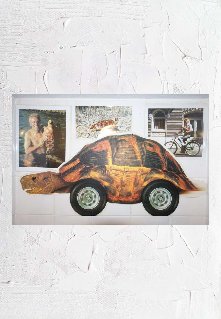 Die Schildkröte auf Rädern ist ein Werbemotiv der Zürich Versicherung, Karton, Größe 75 cm. Die Aufnahmen des freien Fotografen illustrieren einen "seltenen Fang" am Starnberger See, einschließlich Transport, präsentiert in meinem WC.