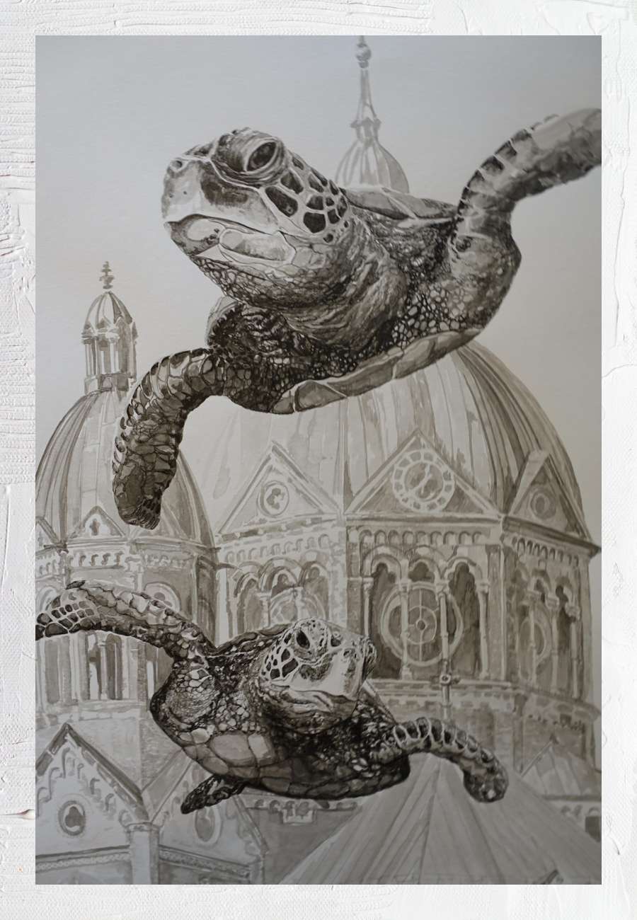 Auftragsarbeit (es war ihr erster Auftrag), Orginalzeichnung mit Feder, Tusche und Pinsel, sign., Größe 55 x 42 cm. Die Meereschildkröten schweben auf meinen Wunsch vor der St. Lukas-Kirche im Lehel. Außerdem war ich von den Arbeiten bei ihrer 1. Einzelausstellung im Krichbaumhof (München/Haidhausen) beeindruckt. Die Künstlerin studierte Klavier, Gesang