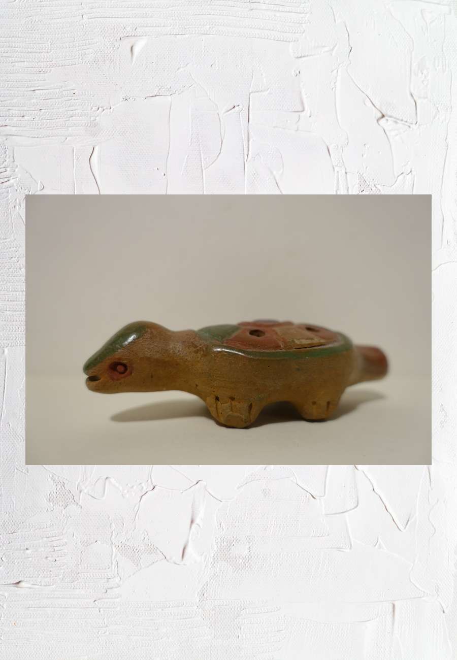 Dieses Objekt aus Peru gehört zu einer Reihe von Okarinas, handgetöpfert, Größe 11 cm. Das kleine Blasinstrument ist ähnlich zu spielen wie eine Blockflöte.