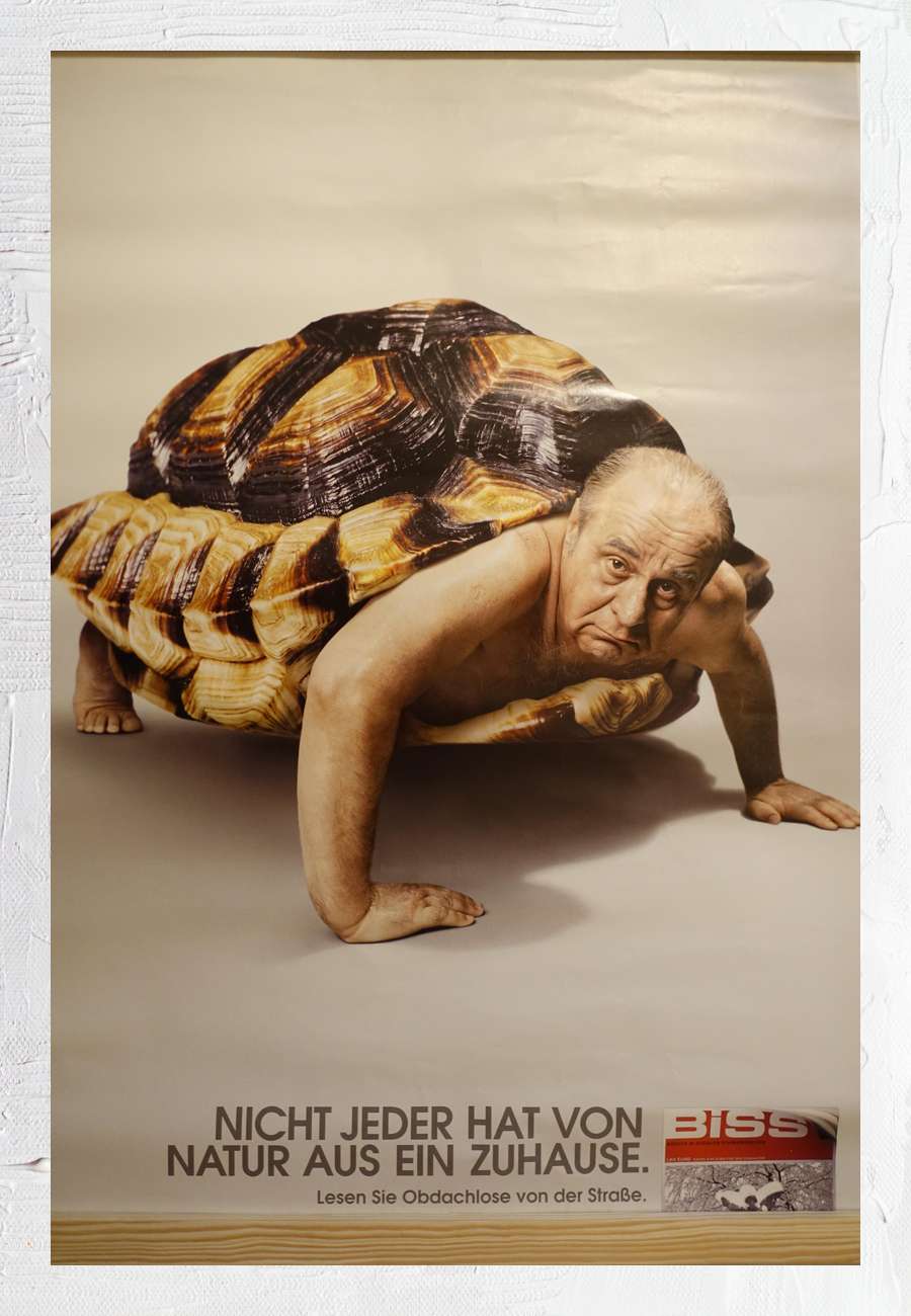 Werbeplakat für das Magazin BISS (Bürger In Sozialen Schwierigkeiten), München, Format 84 x 59 cm. Plakate mit allgemein beliebten Tiermotiven sind gute Werbeträger für die unterschiedlichsten Anliegen, z.B. Ausstellungen (u.a. Paik, World Press Photo), Filme, Artenschutz (s. Dorismar), Sparkassen, Versicherungen (etc.). Übrigens steckte ich auf Galapagos selbst im Panzer einer Riesenschildkröte (s. Kategorie Fotos).