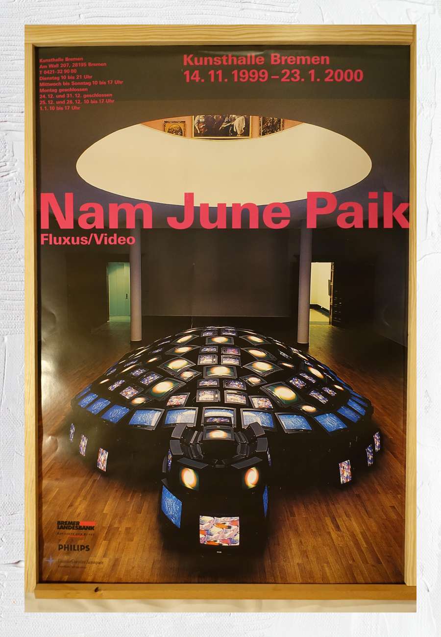 Poster zur großartigen Ausstellung in Bremen, Format 84 x 59 cm. Das Motiv ist auch auf dem Cover des reich bebilderten Kataloges von Wulf Herzogenrath und Sabine Maria Schmidt (400 Seiten). Zitat-Ausschnitt von Paik zu dieser gigantischen Arbeit: "Der Überfluß der Bilder löscht das einzelne Bild aus. Es büßt seine Lesbarkeit ein, .... Damit hat die Schildkröte als Symbol der Weisheit ihren Sinn erfüllt!". Der Künstler ist ein Fixstern der Kunstavantgarde des 20. Jahrhunderts.