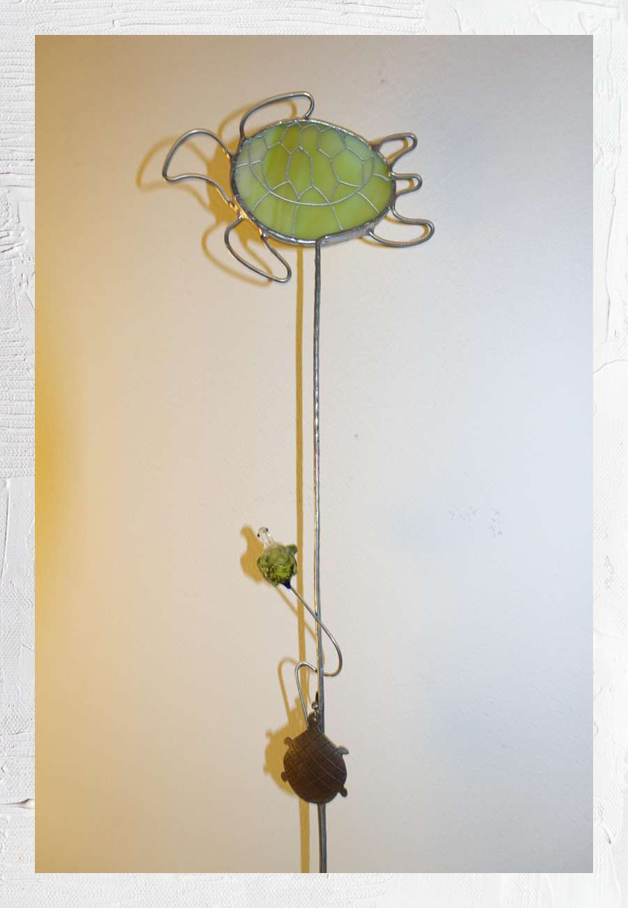 die große Schildkröte (ca. 11 cm) ist aus einer Achatscheibe geschnitten, mit Blei gelötet und gefasst, Atelier in Schloß Seefeld (Pilsensee), Höhe 41 cm.