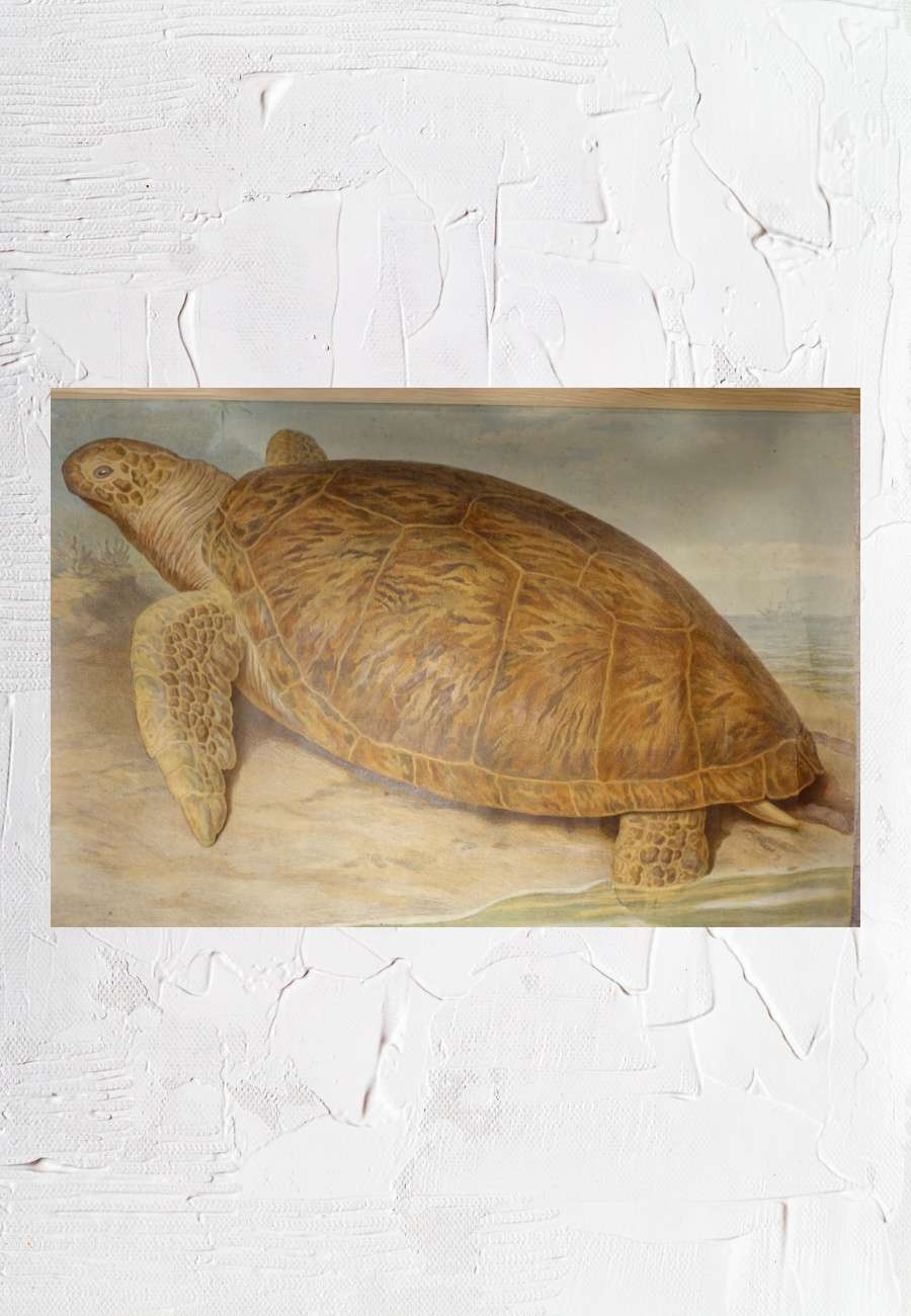 Wandtafel für Schulen (Lohmanschool Scheveningen), Format 80 x 58 cm, beschriftet mit "Chelone imbricata, Riesenschildkröte, Green turtle, Tortuga grande de las Indias". Der heute bei uns gebräuchliche Trivialname: Suppenschildkröte. Den englischen Namen tragen sie jedoch wegen der Farbe ihres begehrten Fettes.