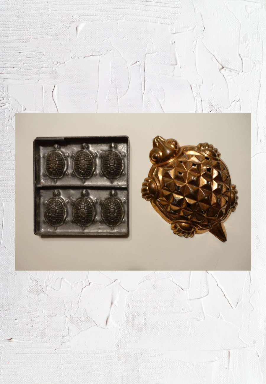 Model zur Abformung von Schokolade, aus den 1920er Jahren, Größe ca. 14 x 14 cm., sowie ein deutlich älteres Kupfermodel für Backwaren, Größe 19 cm.