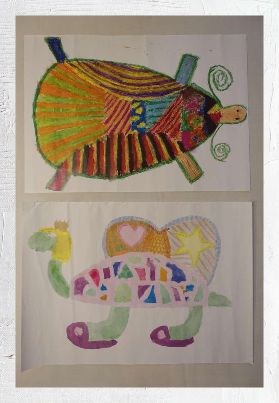 Farbkopie, Format je DIN A 3, Thema Schildkröte im Kunstunterricht, aus Datenschutz ohne Namensangabe, Alter 12 Jahre.