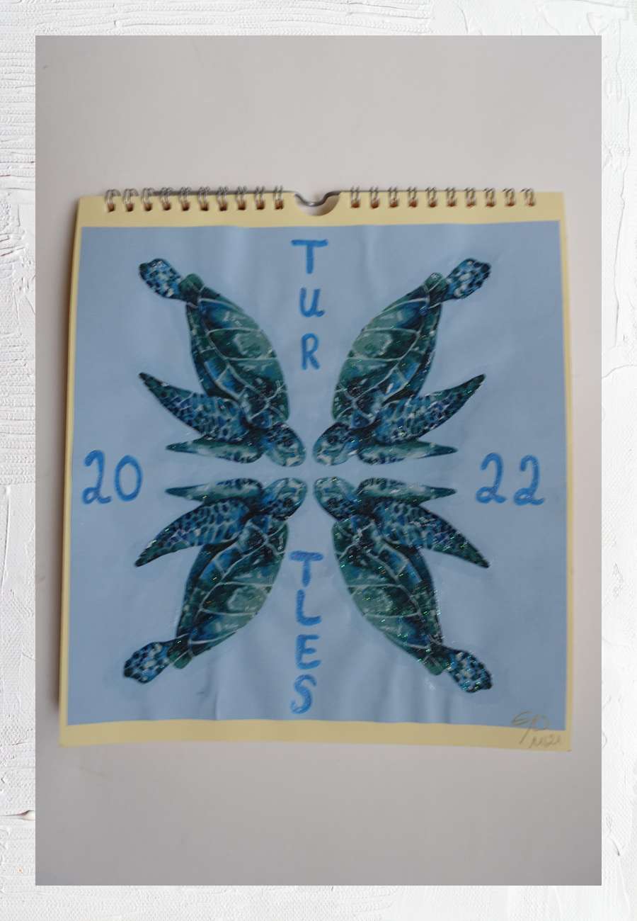Fotokalender mit Schildkrötenmotiven, diesmal vorwiegend aus Deutschland, das Deckblatt ist immer kreativ gestaltet.