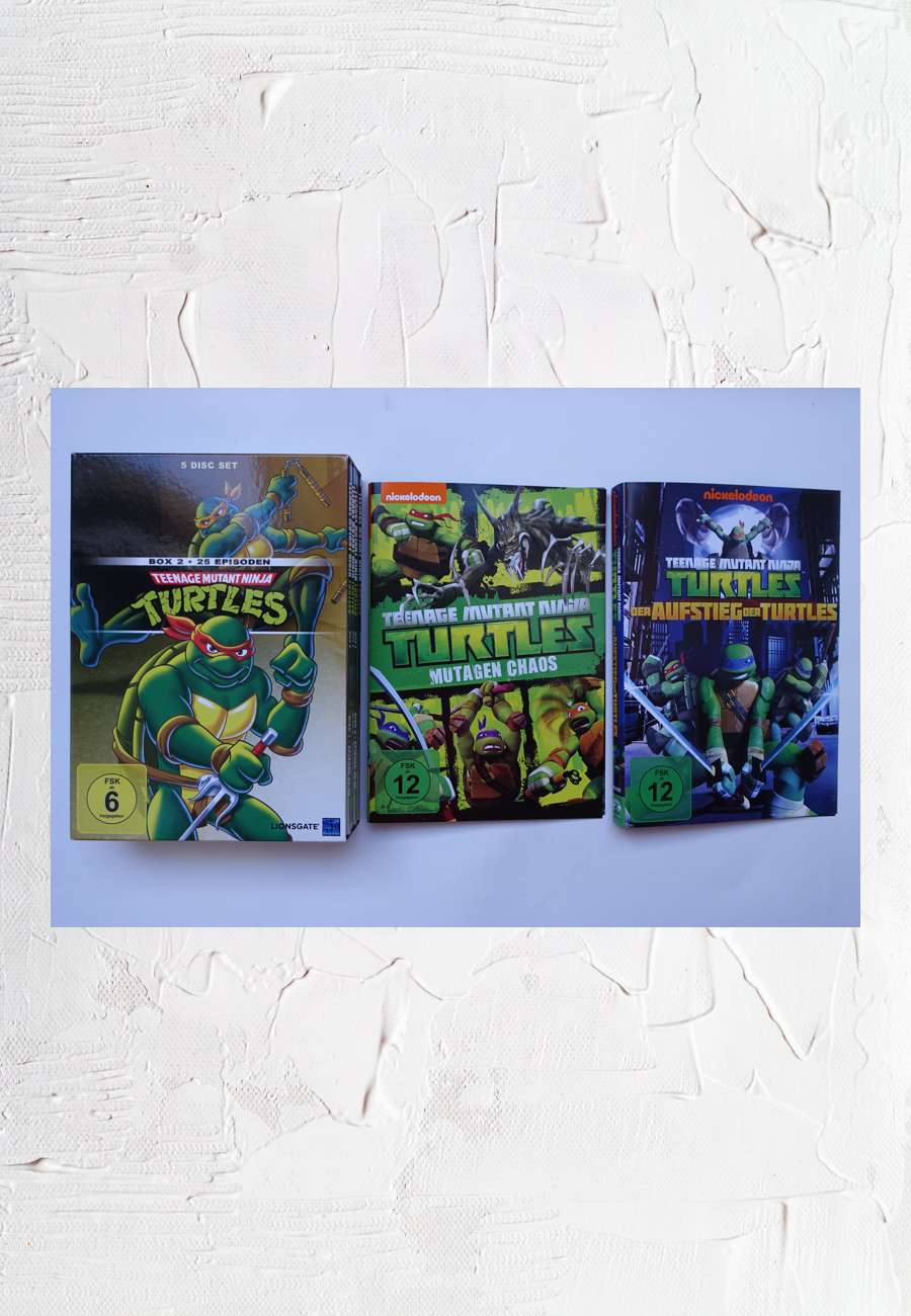 Drei Filme mit Teenage Mutant Ninja Turtles (Kampfschildkröten mit den schönen Namen Leonardo, Donatello, Raphael und Michelangelo), Laufzeit 550, 132 und 109 Minuten.