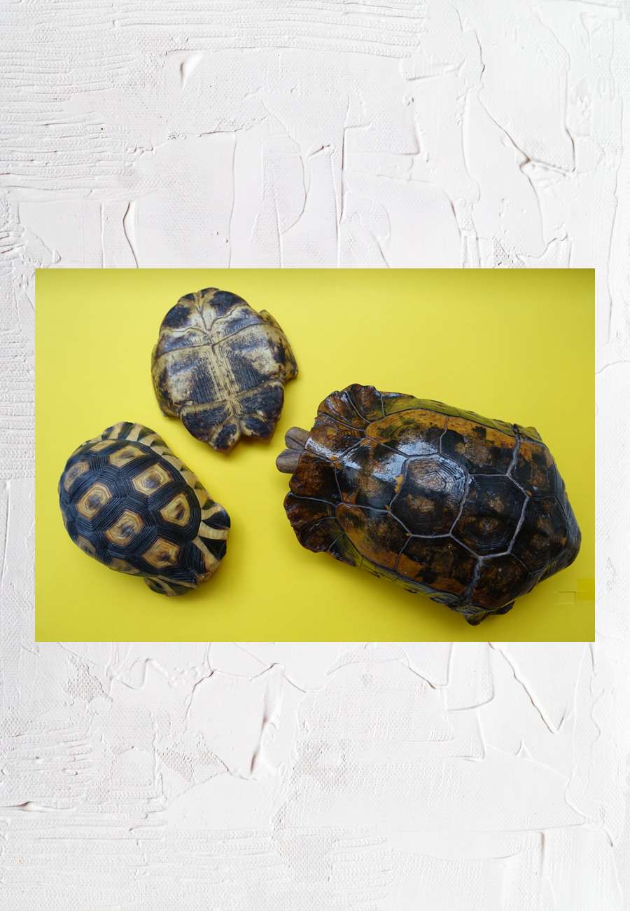 Zwei Schildkrötenpanzer und die Bodenplatte eines Panzers.