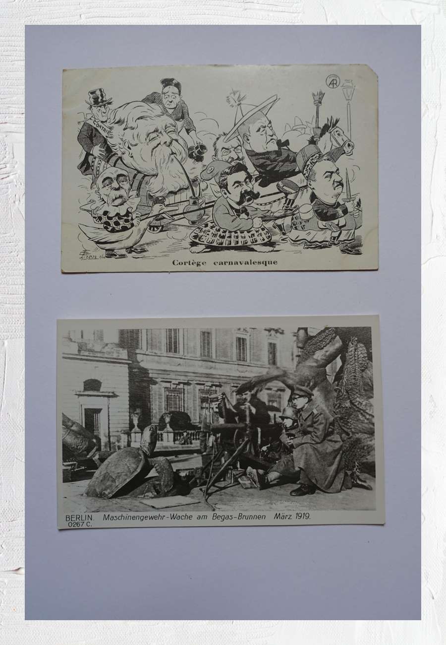 Oben: Karikatur eines Festzugs von Politikern, einer davon auf der Schildkröte sitzend (Frankreich, ca. 1906). Unten: Maschinengewehr-Wache am Neptunbrunnen, Berlin (1919). Der Bildhauer Reinhold Begas ist durch die monumentale Brunnenanlage (von der man hier nur die Schildkröte sieht) berühmt geworden.