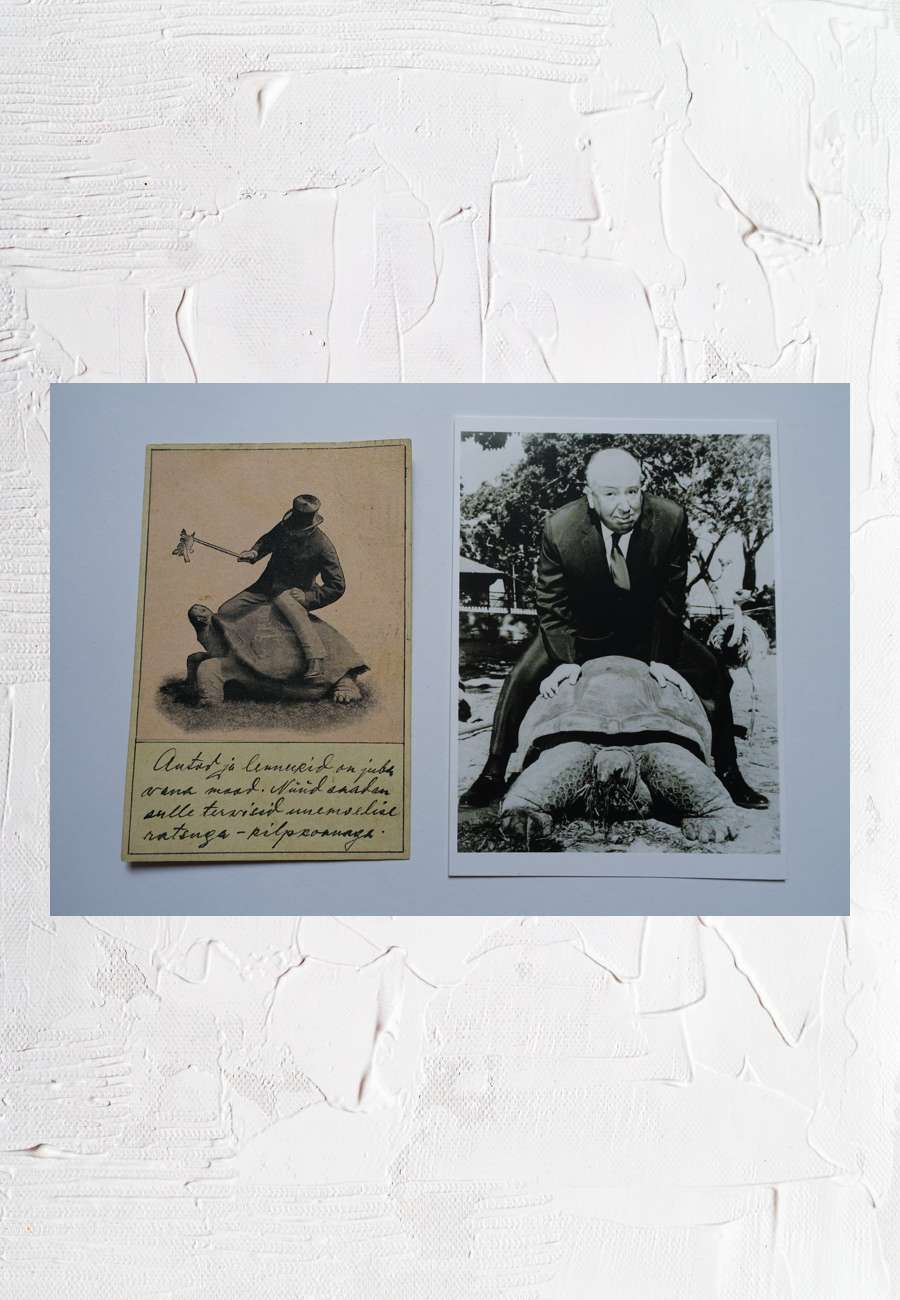 Tallin abgestempelt, sie dürfte aber etwas älter sein. Diese Darstellung wurde später auf individuelle Art mehrfach übernommen, siehe weitere Postkarten (z.B. von Anita Jaram) oder Fotos. Rechts sitzt Alfred Hitchcock (Filmregisseur, Drehbuchautor und Filmproduzent) in einem australischen Zoo, wohl mehr zur Schau, ebenfalls auf einer Riesenschildkröte (um 1960).
