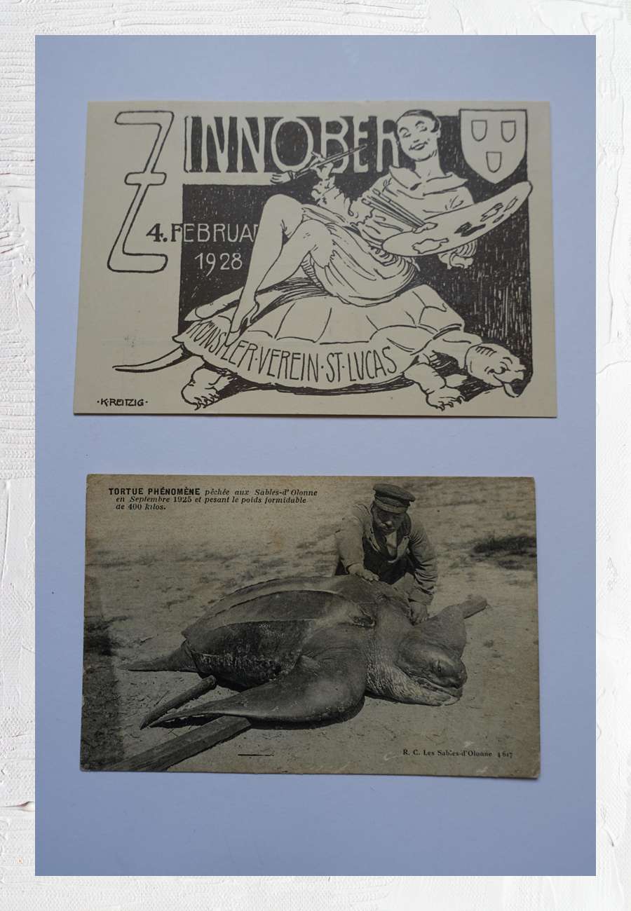 Karte zum Künstlerfest "Zinnober" (1928 in Magdeburg) und eine französische Karte (von 1925) mit dem ungewöhnlichen Fund einer 400 kg schweren Lederschildkröte durch einen Fischer.
