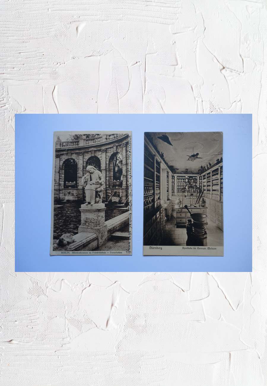 (Leipzig, um ca. 1900) schwebt eine Meeresschildkröte an der Decke. Es gibt eine weitere Postkarte der gleichen Apotheke (Germanisches Museum in Nürnberg), aus anderer Perspektive und im Querformat, mit abgestempelter Briefmarke (Bayern, 5 Pfennig) vom 6.8.1903. Schildkröten und Krokodile wurden früher von Apothekern zur Herstellung von Medizin genutzt (s. auch Albertus Seba). Um für ihre kostspieligen Produkte zu werben, hingen diese eindrucksvollen Tiere dann im Laden, oft an der Decke.