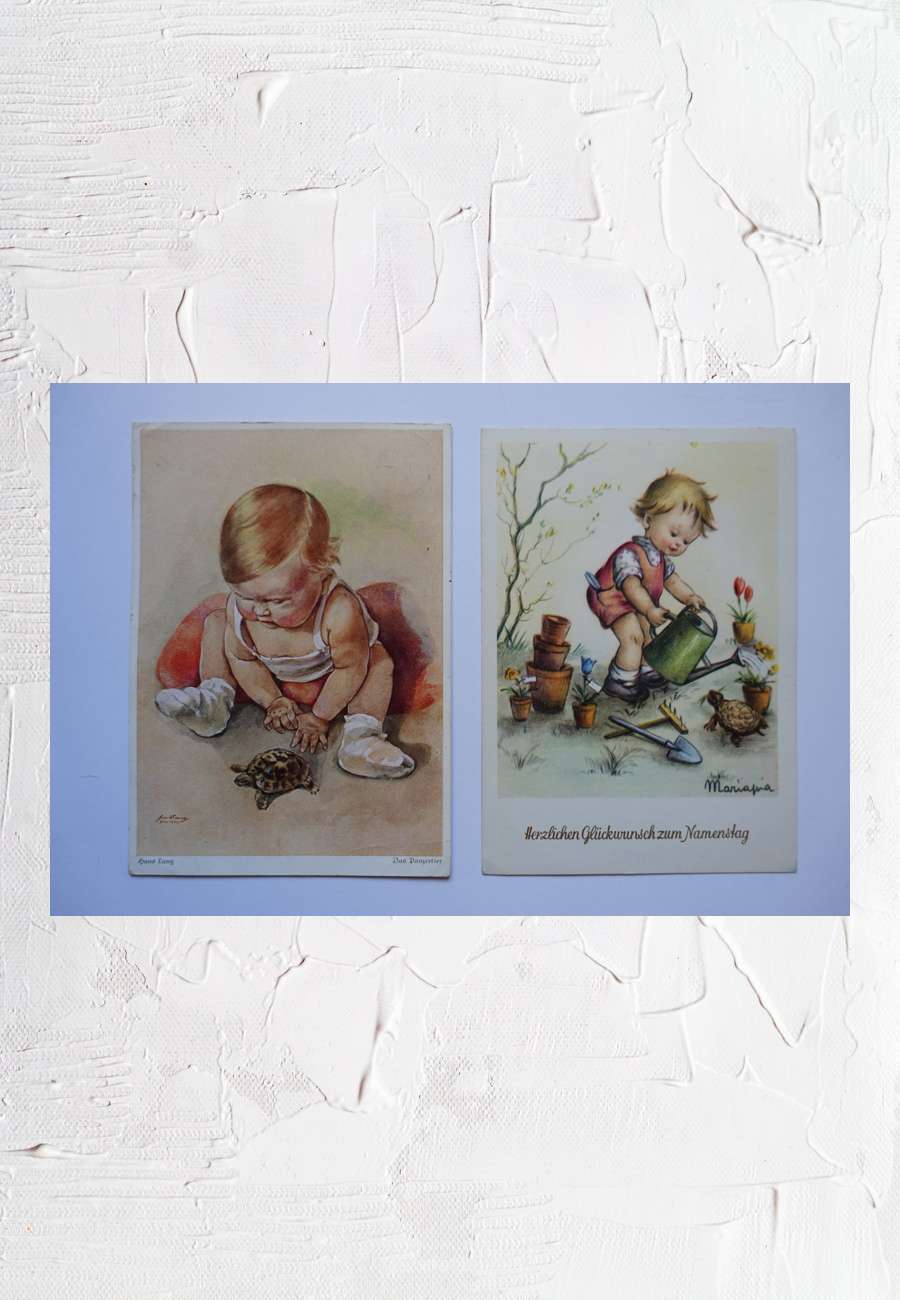 Die linke Karte ist rückseitig mit einer 1935 abgestempelten Briefmarke (Hindenburg) versehen und enthält neben banalen Mitteilungen den Gruß "Heil Hitler". Aus dieser Zeit stammt auch die zweite Karte, gemalt von Mariapia. Die Künstlerin hat sich auf niedliche Kindermotive spezialisiert.