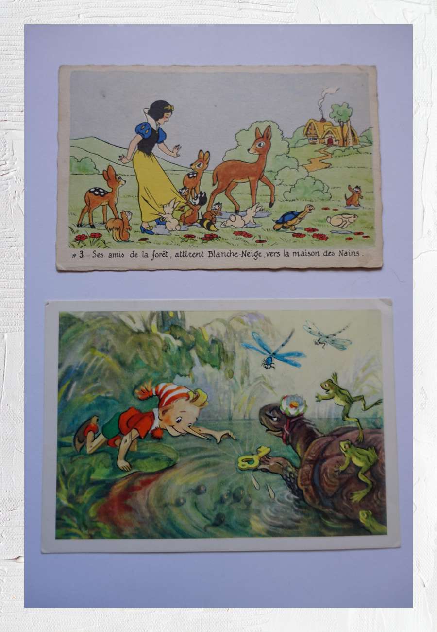 Die obere Karte wurde ca. 1939 in Paris gedruckt, das Motiv stammt von Walt Disney, der Text lautet sinngemäß "Ihre Waldfreunde locken Schneewittchen zum Haus der Zwerge". Die untere Karte wurde 1967 in Moskau gedruckt, zugrunde liegt die Adaption von A. Tolstoi "Burattino oder das goldene Schlüsselchen", von Leonid Vladimirsky 1953 gemalt. Das Motiv geht auf Italiens bekannteste Märchengestalt "Pinocchio" zurück, dessen Nase bei jeder