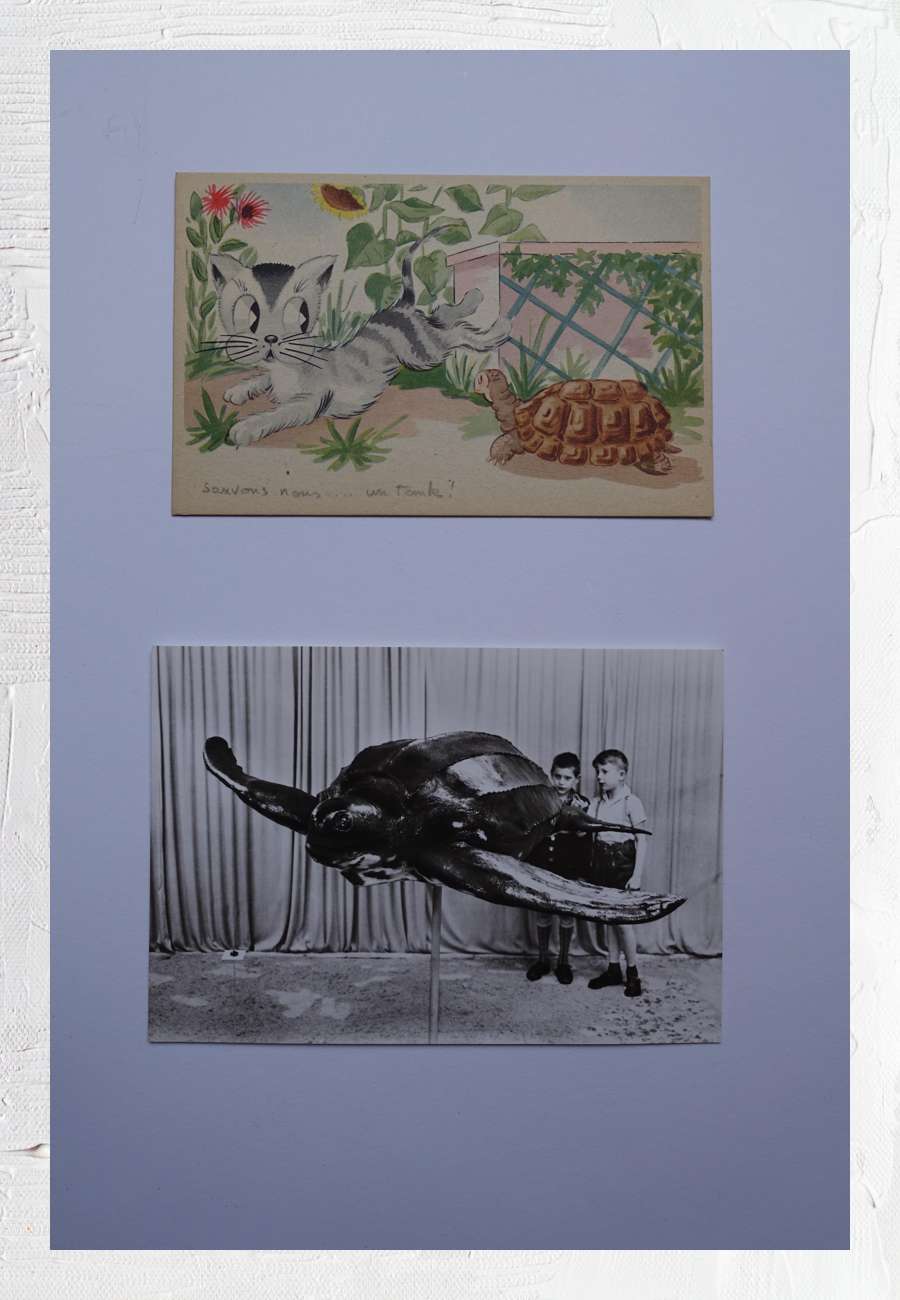 Französische Karte aus den 1930er Jahren, die größere Katze flieht vor einer Schildkröte (Text sinngemäß: "Rette uns ... vor einem Panzer!"). Die untere Karte von 1966 zeigt eine Lederschildkröte, gefangen von Fischern und ausgestellt im Meeresmuseum Stralsund. Wie aus einer weiteren Postkarte ( ebenfalls ein Schwarz-