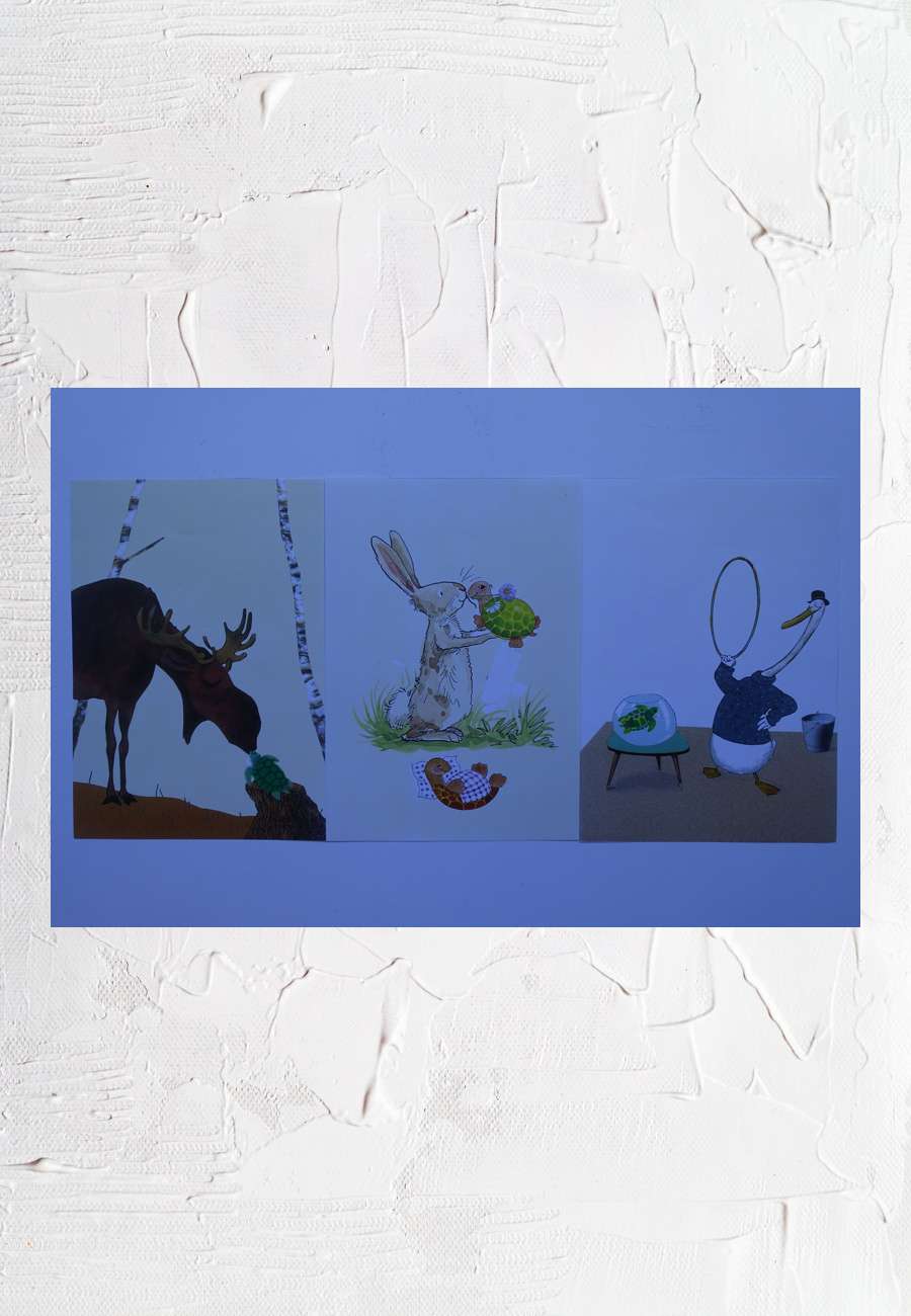 Drei Postkartenmotive, verfremdet mit Stickern.