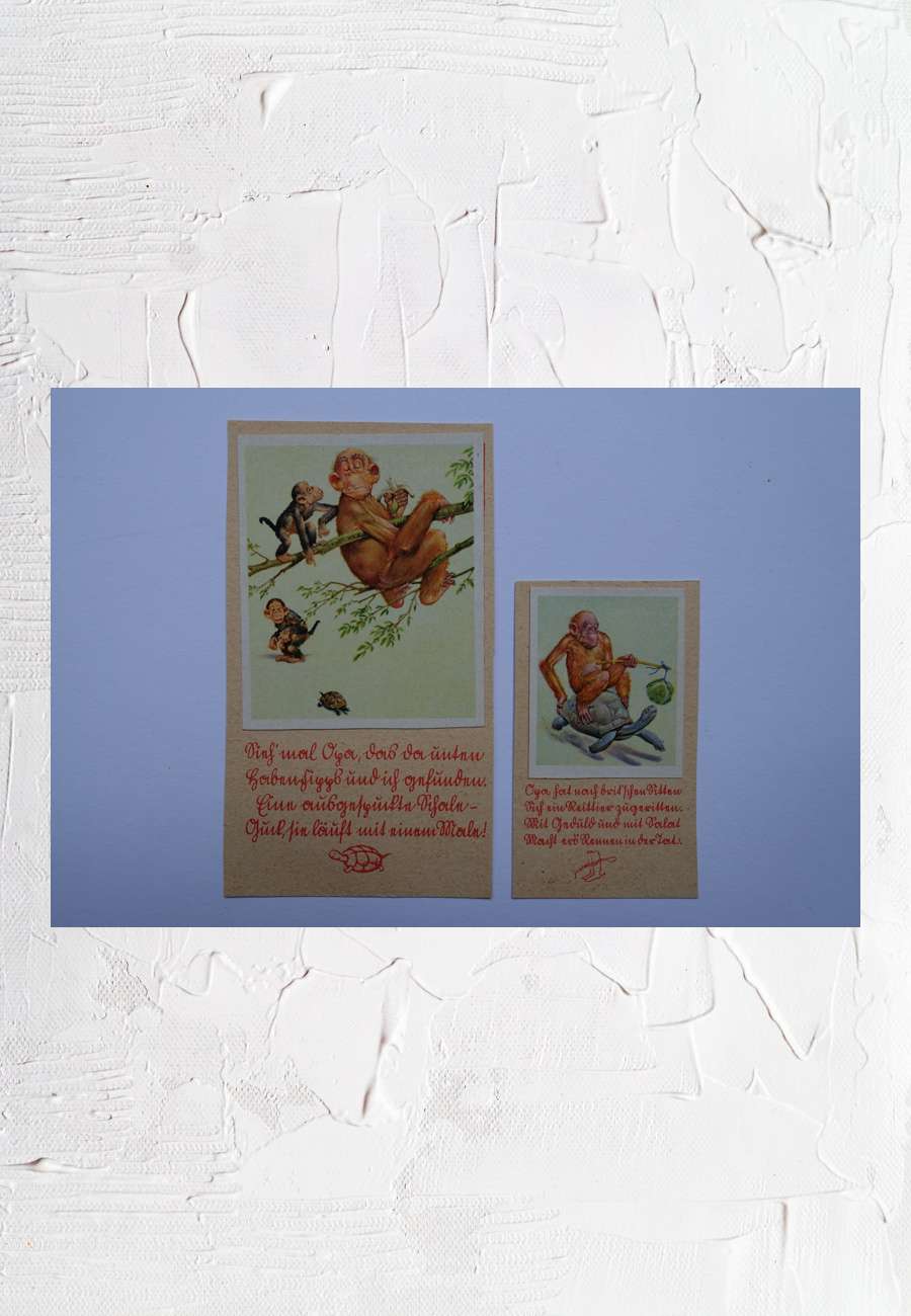 Die Sammelkarten (Zigarettenfabrik Richard Greiling, Dresden) zeigen den Humor der 1930er Jahre. Der Künstler ist nicht bekannt, die Verse dazu sind von Rudolf Presber, Schriftsteller und Bühnenautor. Wegen der alten Schriftform vorsorgliche "Übersetzung" (rechts): Opa hat nach brit'schen Sitten sich ein Reittier zugeritten. Mit Geduld und mit Salat macht er's Rennen in der Tat. Format 10 x 5,7 und 6,8 x 4 cm. Das linke Bild gibt es auch noch in niederländischer Variante, jedoch