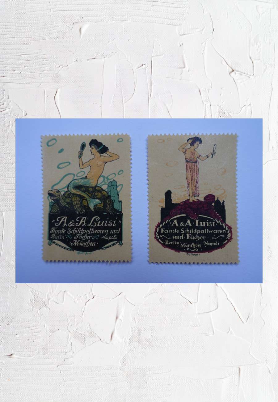 Werbemarken für "Feinste Schildpattwaren", 1913 gestaltet von Kurt Böttcher, Format 3,8 x 5,5 cm.