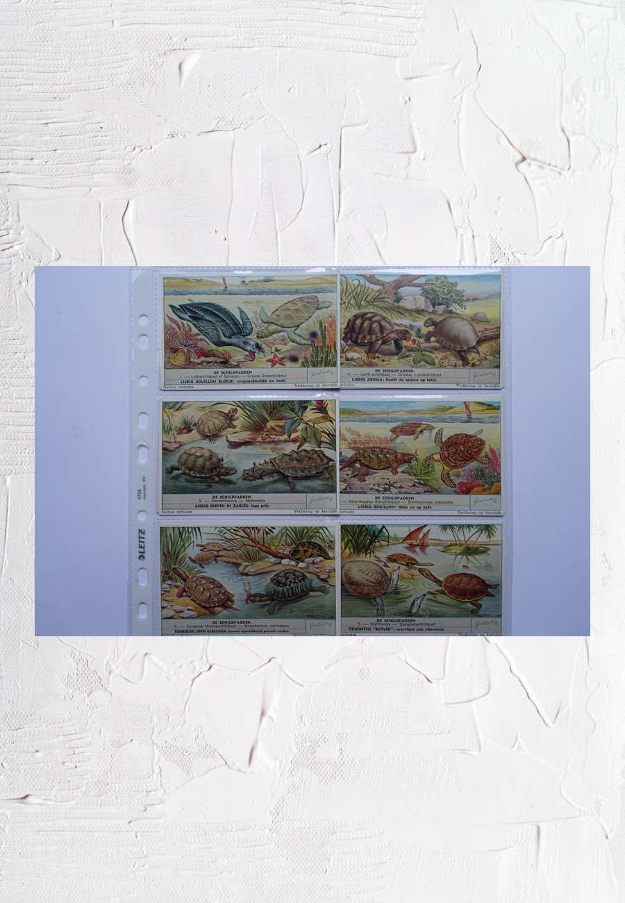 Ein Satz mit niederländischen Sammelkarten von Liebig, rückseitig mit Erläuterungen zu diversen Schildkrötenarten, Format 11 x 7 cm. Diese Bildchen gibt es in mehreren Sprachen , sie wurden den Produktpackungen für Fleischextrakt beigefügt (eine geschickte Werbestrategie). Dies führte zwischen 1890 und 1910 zu einer extremen
