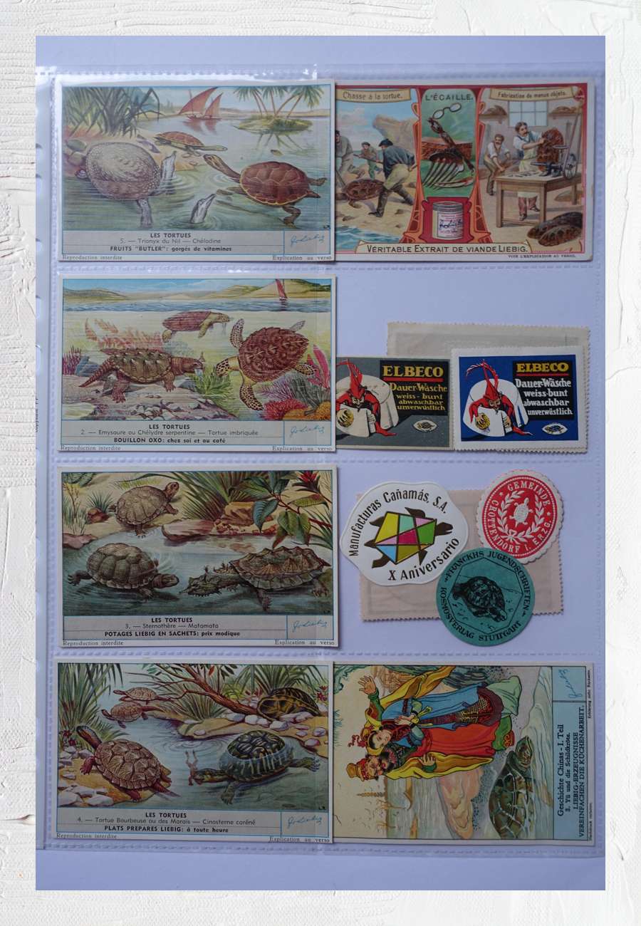 Weitere Liebig-Sammelkarten (rechts oben: Schildpatt-Verarbeitung, Dosensuppe) sowie diverse Werbemarken. Übrigens: König Max II. holte den Chemiker Justus von Liebig nach München. Neben bedeutenden Forschungen entwickelte er auch den nach ihm benannten Fleischextrakt. Die dazu gehörigen Sammelbilder erfreuen sich immer noch großer Beliebtheit. In München befinden sich sowohl seine Grabstätte (Alter Südlicher Friedhof) als auch ein lebensgroßes Denkmal (Maximiliansplatz).