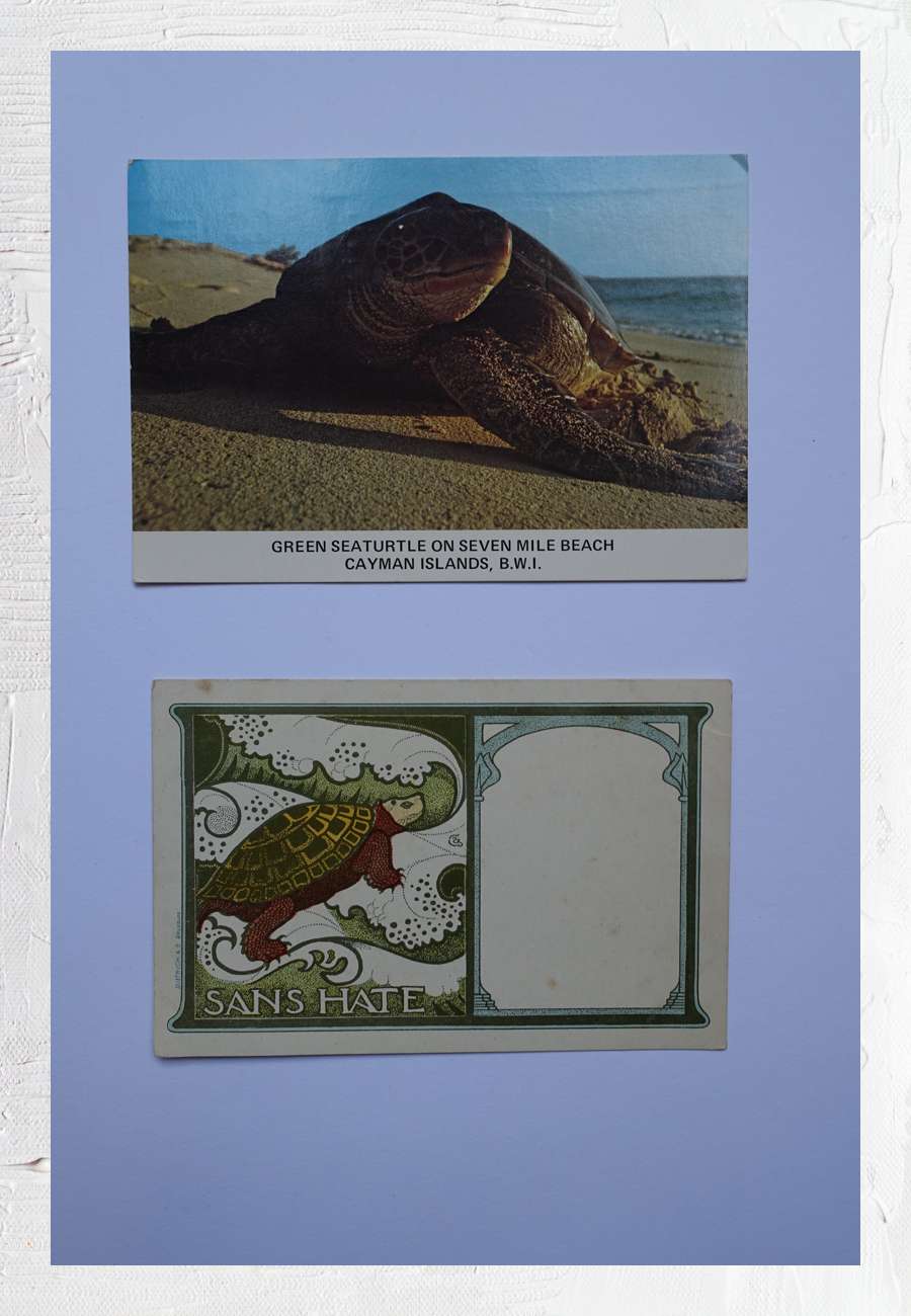 Karte mit rückseitigem Logo der Cayman Turtle Farm und schöner Sondermarke (abgestempelt 1977). Die zweite Karte wurde in Brüssel gedruckt, Jugendstil, um 1905, Text sinngemäß: "Ohne Eile". Stilistisches Vorbild sind japanische Farbholzschnitte, die zu dieser Zeit recht populär waren.