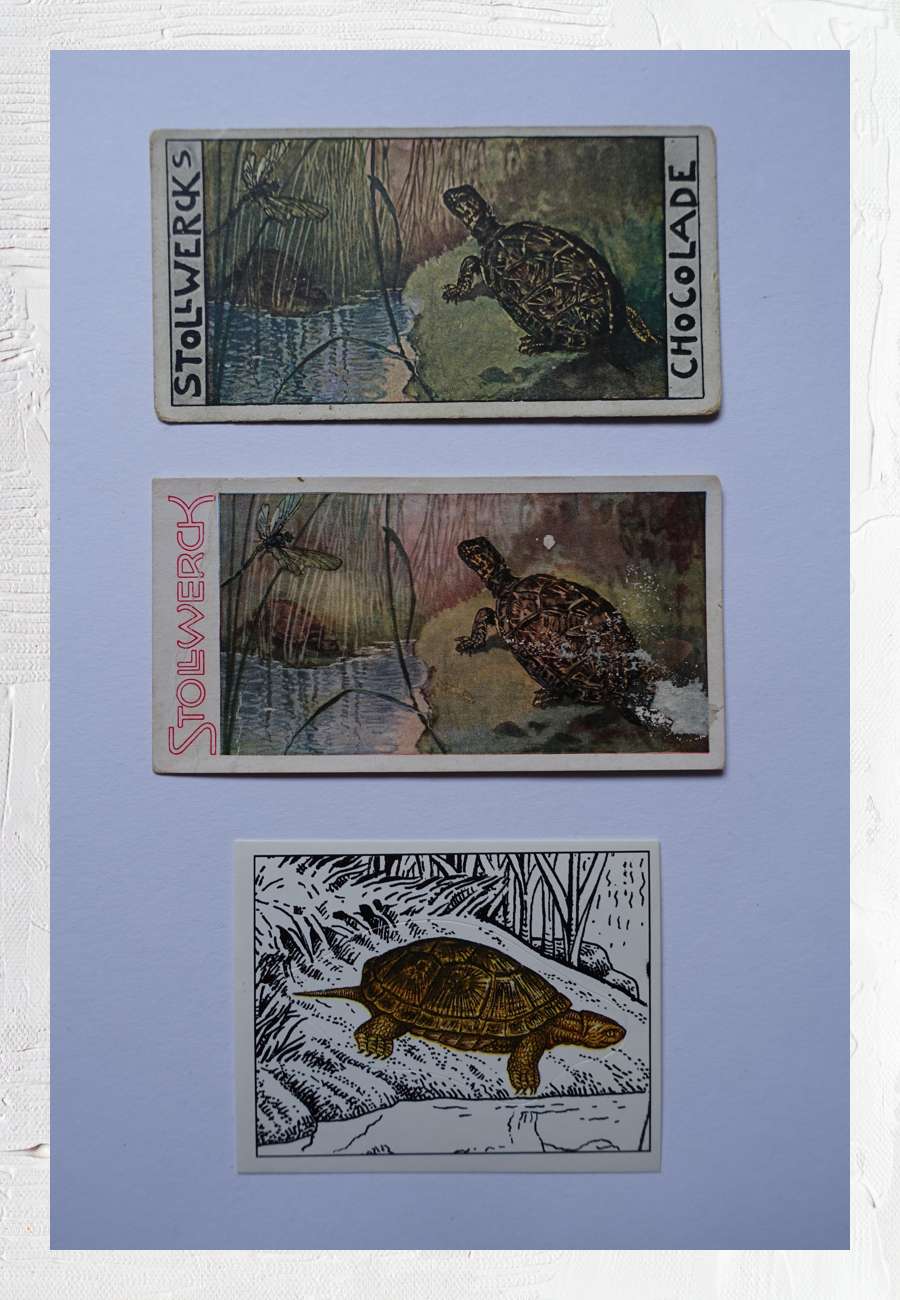 Auch Stollwerck wirbt um 1905 mit Sammelkarten aus dem Tierreich, hier in zwei Varianten, auch die rückseitigen Informationen unterscheiden sich, Format 9,2 x 4,8 cm. Auf dem unteren Bild wirbt PANINI (Italien) in Zusammenarbeit mit WWF (Panda-Symbol rückseitig) für die bedrohte Natur. 1987 macht man das natürlich moderner, die Schildkröte läßt sich wie ein Sticker abziehen.