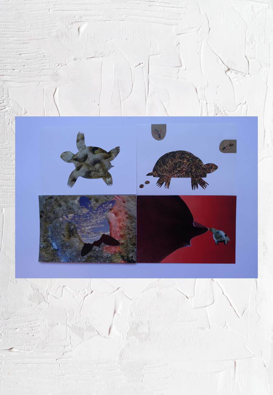 Eigene Collagen, unter Verwendung von Fotomotiven (Bauernbrot, Bienen, Wolken und Rosenblatt = Einladungskarte von Hermann Bigelmayr), Format DIN A 6.