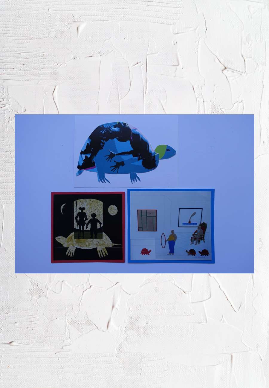 Eigene Collagen, mal betont ein menschlicher Körper den Panzer, mal inspirierte Don Quichotte oder eine Künstlerarbeit im Schaufenster der Galerie