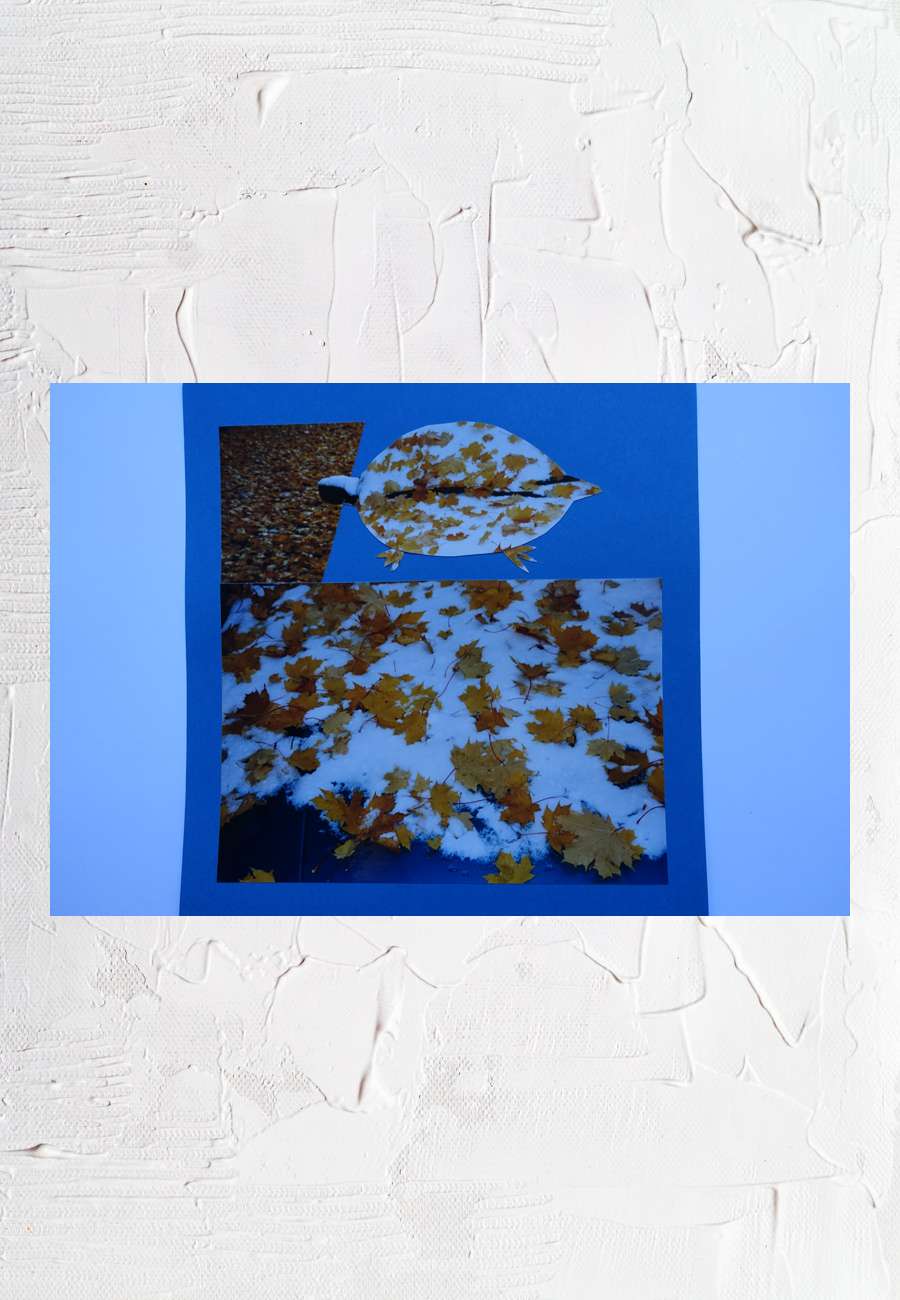 Fotocollage, animiert durch die Farbkontraste von Herbstlaub und Schnee, Format 21 x 21 cm.