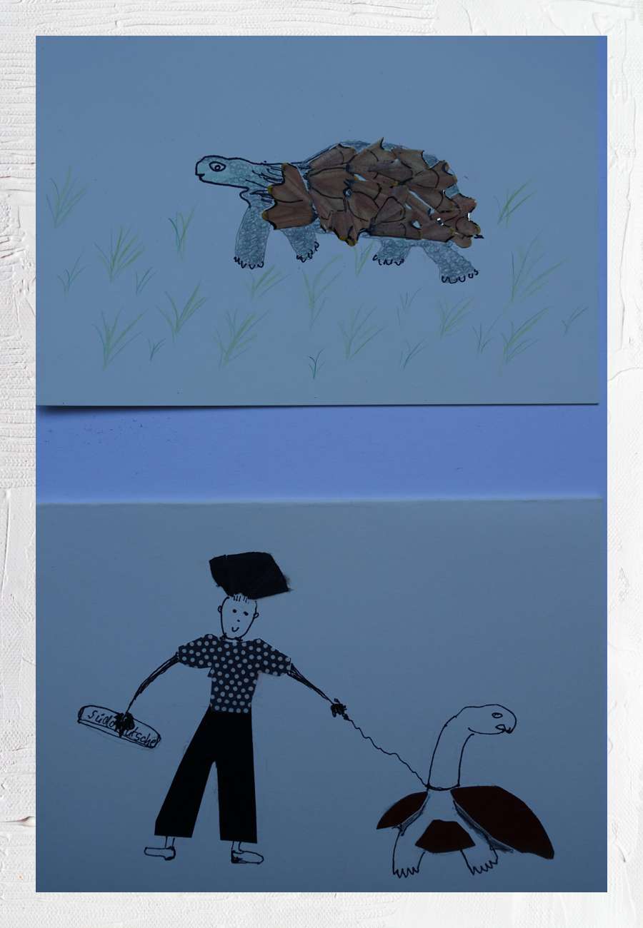 Kleine Auftragsarbeiten, oben eine Collage aus Zeichnung und Spitzerschmutz. Die ehemalige Solotänzerin (in großen Opernhäusern) ist in München als professionelle Fotografin und Webdesignerin tätig. Bei der unteren Arbeit kamen Tusche,