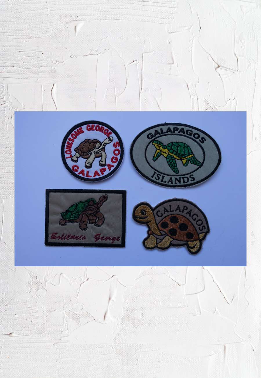 Zu den Mitbringseln aus Galapagos (Ecuador) gehören diese Aufnäher, Größe 7 - 10 cm. Besonders "Lonesome George" wird vielfältig vermarktet.