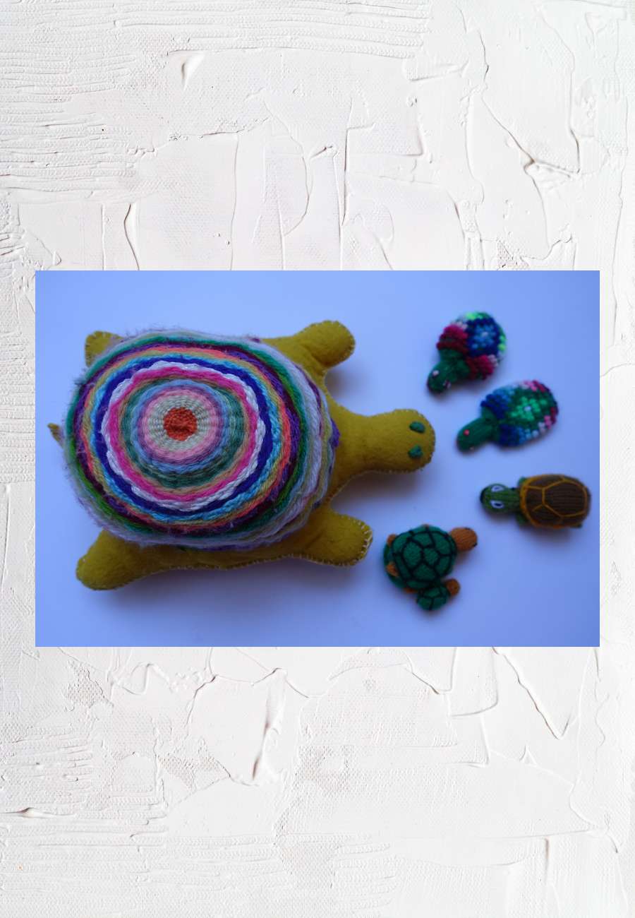 Hübsche Handarbeiten, das große Objekt aus Filz und Wollfäden hat die Schülerin Tabea geschickt gestaltet und genäht, Größe 24 cm, die kleinen sind Fingerpuppen aus Südamerika, Größe ca. 7 cm.