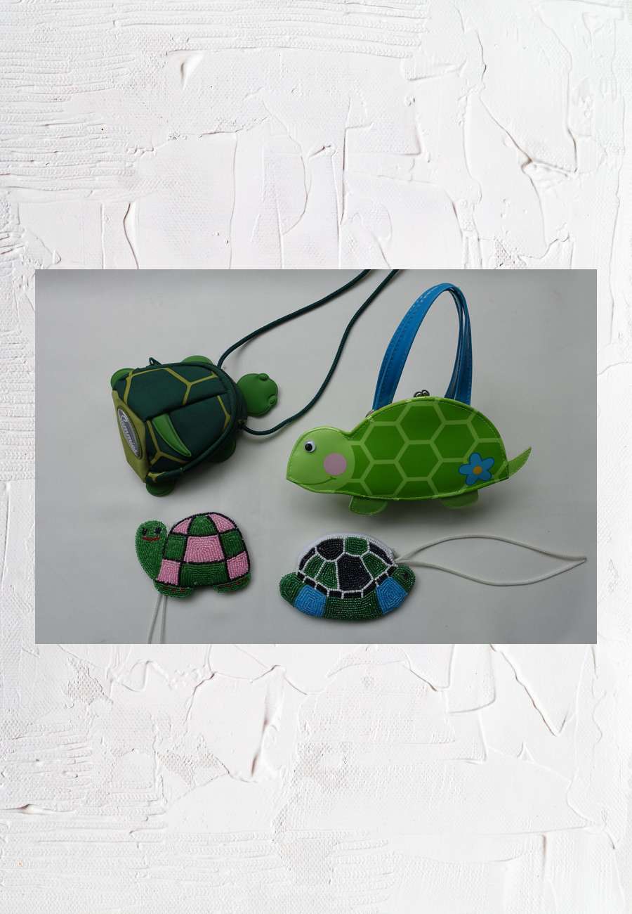 Geldbörsen, um den Hals oder am Handgelenk zu tragen, mit Reißverschluß bzw. Klappverschluß (Metall), links oben aus Polyester (Samsonite, Made in Vietnam), daneben in Form eines Plastik-Handtäschchens, unten aus Stoff, vollständig mit kleinen Glasperlchen besetzt.