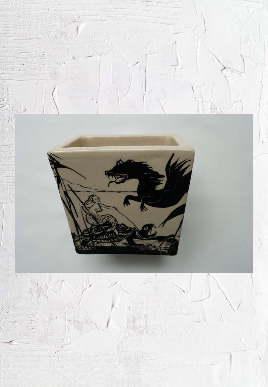 Gefäß, Unikat, Keramikarbeit von Tina Pause (sie begann bei Nandl Eska), Grundfläche 11 x 7 cm, Höhe 11,5 cm, sign. Das Objekt ist von allen Seiten mit schwarzer Engobe bemalt, Frau Kotter hat Malerei studiert (Meisterschülerin bei