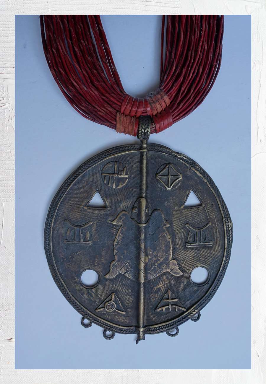 Schmuck, Anhänger aus Bronze mit wichtigen Statussymbolen, an geflochtenem Lederhalsband, Ethnie der Baule, Durchmesser 16 cm.