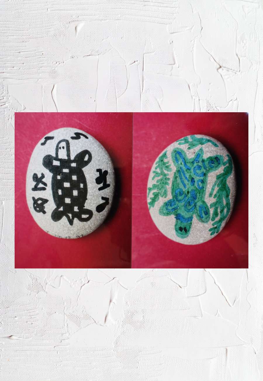 Flacher Kieselstein, von der Schülerin (Alter 13 Jahre) beidseitig handbemalt, Größe ca. 7 cm.
