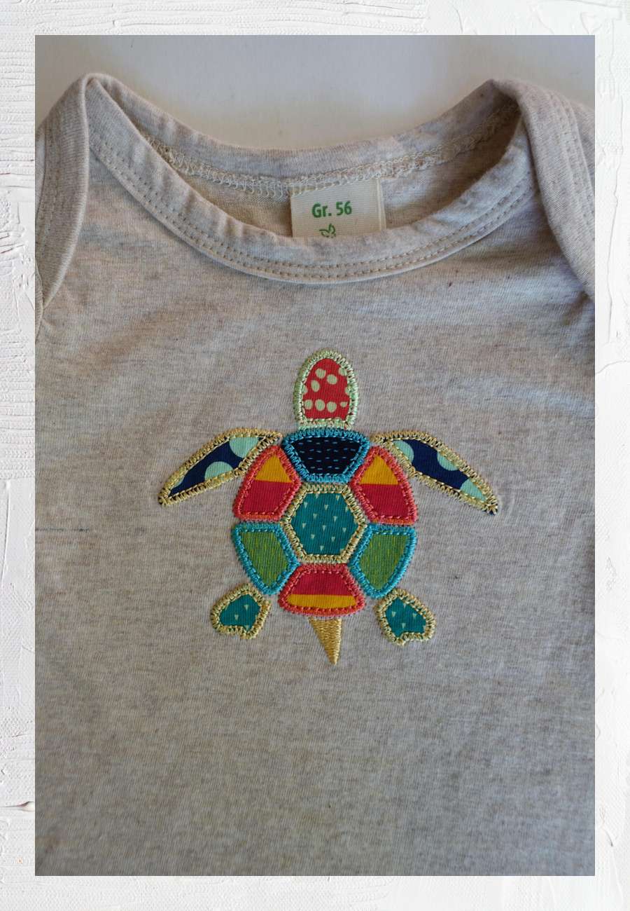 Baby-T-shirt mit aufgesetzter Patchwork-Schildkröte, Fa. Alana, 100 % Baumwolle (aus kontrolliert biologischem Anbau), hergestellt in Indien.